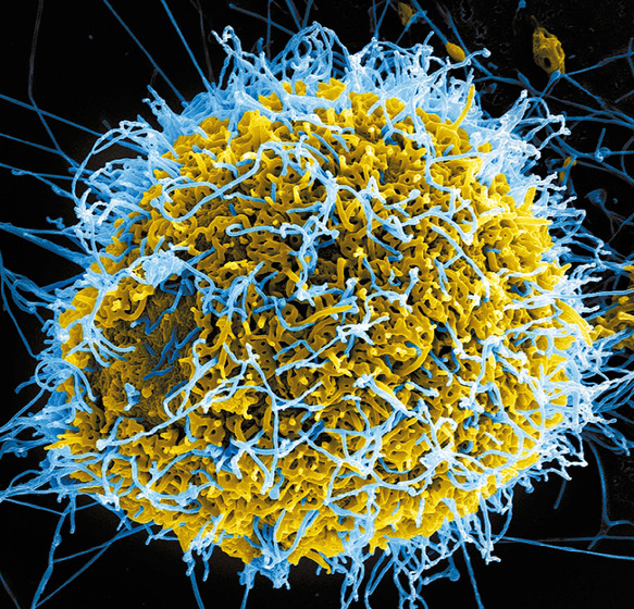 에볼라 바이러스의 전자현미경 사진. 감염된 동물세포(노란색)에서 밖으로 나오는 에볼라 바이러스(청색).
