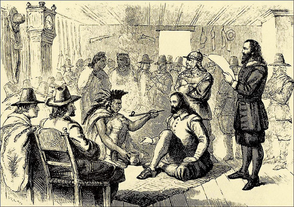 인디언들이 유럽 정복자들에게 평화의 상징인 파이프 담배를 권하고 있다(1621년).