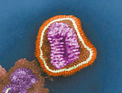 인플루엔자(독감) 바이러스. 둥근 바이러스 외피 안에서 변이가 잘 되는 RNA 유전자가 보인다.