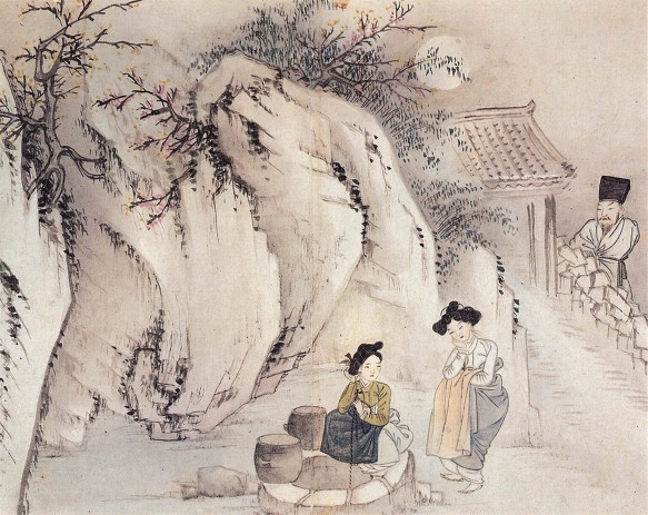 보름달이 떠오르는 초저녁 여염의 두 여인이 우물가에 앉아 있다. 우리 선조는 물을 길을 때도 옹기 물동이를 만들어 사용하는 현명한 지혜를 발휘했다.