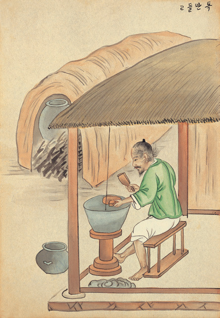 ‘독 만드는 사람’에는 옹기장이의 작업 모습이 담겨 있다. 한 장인이 발로 물레를 차면서 도개와 수레를 가지고 커다란 독을 만들고 있는데, 독 안의 긴 줄은 커다란 독을 만들 때 질을 말리기 위해 숯을 넣은 부드레 장치다. 숯은 독 내부를 말리면서 흙에 남아 있는 불순물을 제거하는 기능을 해서 큰 독을 만들 때 빠지지 않는 재료로 사용됐다. 이 모습은 1970년대까지 그대로 이어졌다.