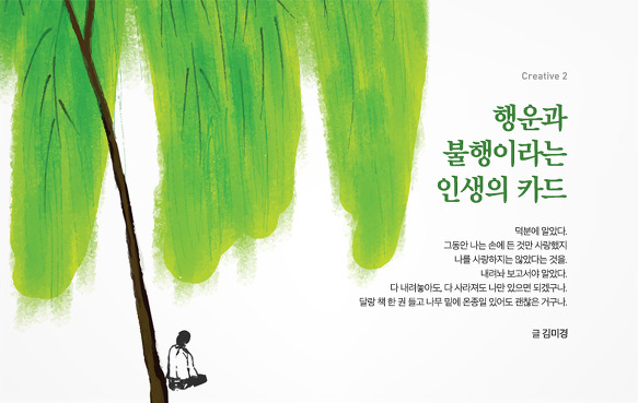 앞면에 불행이 적힌 카드가 오면 화가 나고 억울해서 뒷면을 보지 못하고, 행운이 적힌 카드가 오면 또 무서워서 일부러 뒷면을 외면한다. 그러나 인생에는 반드시 카드를 넘기는 순간이 온다.