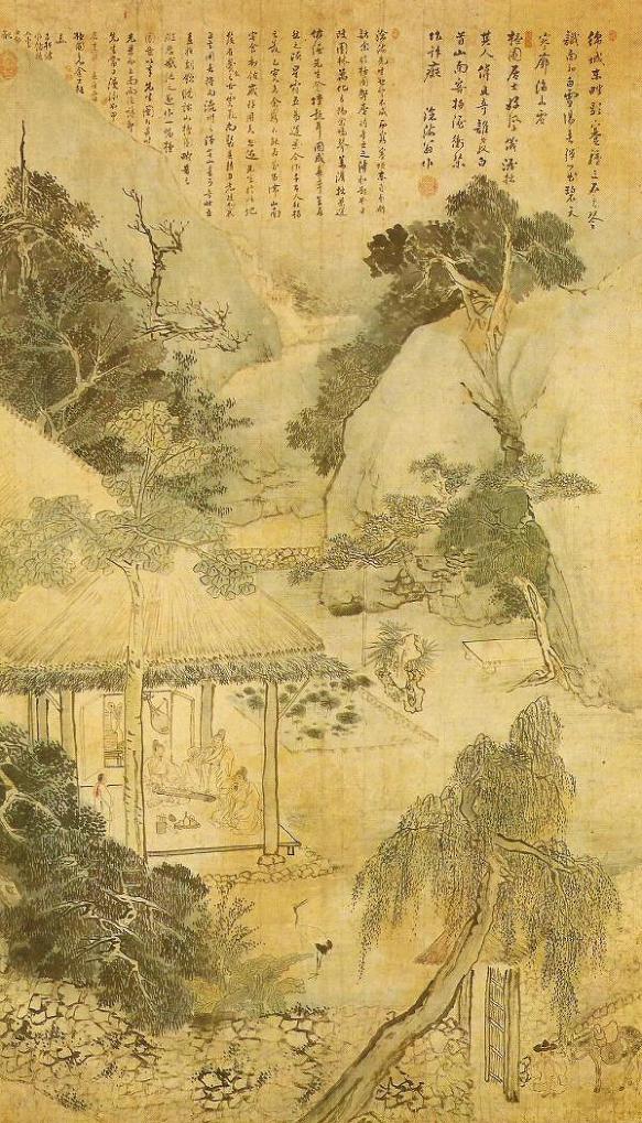 이런 소나무 차양의 실제 모습은 김홍도가 1785년에 자기 집의 후원을 그린 초당 그림에도 나타난다(그림 1 참조).