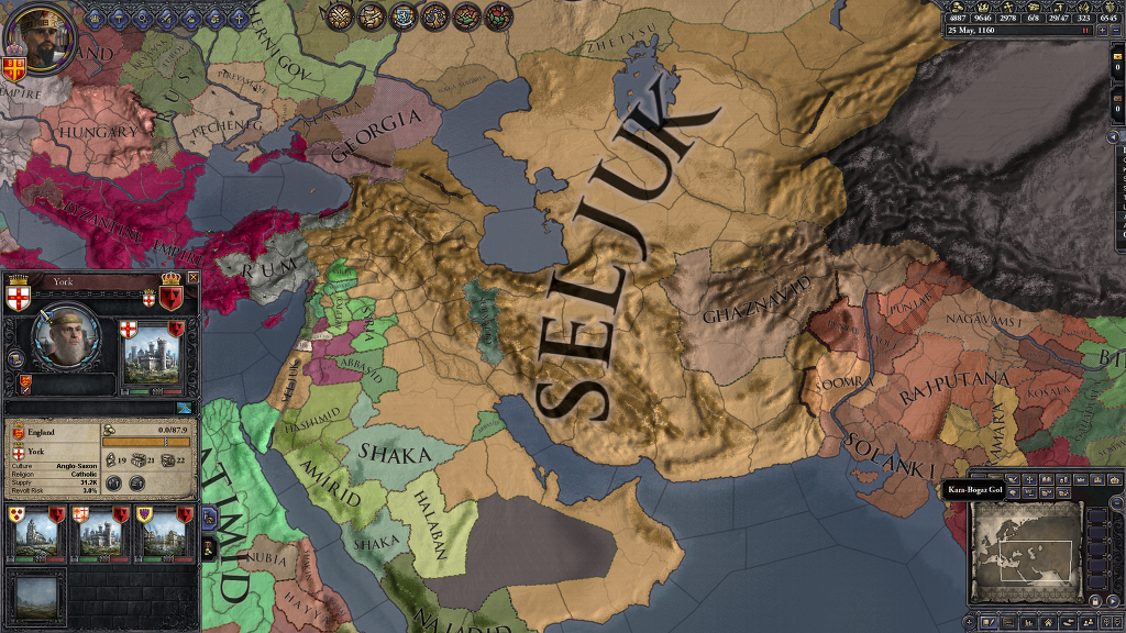 동방의 사막 잡신을 섬기는 투르크 유목민들은 하늘 높은 줄 모르고 날아오르고 있습니다. 룸 술탄국을 무찌르고 아나톨리아를 되찾고 싶지만 인베이젼만 안 걸려도 다행입니다. 50년만 지나면 프레스터 존이 다 박살내러 올 것이니, 그때만 기대해봅니다.