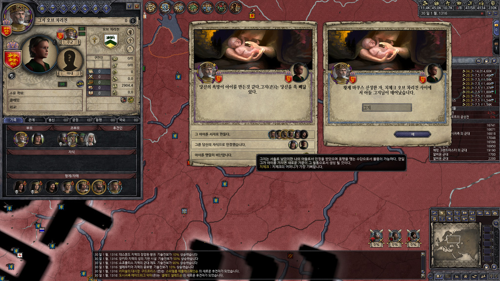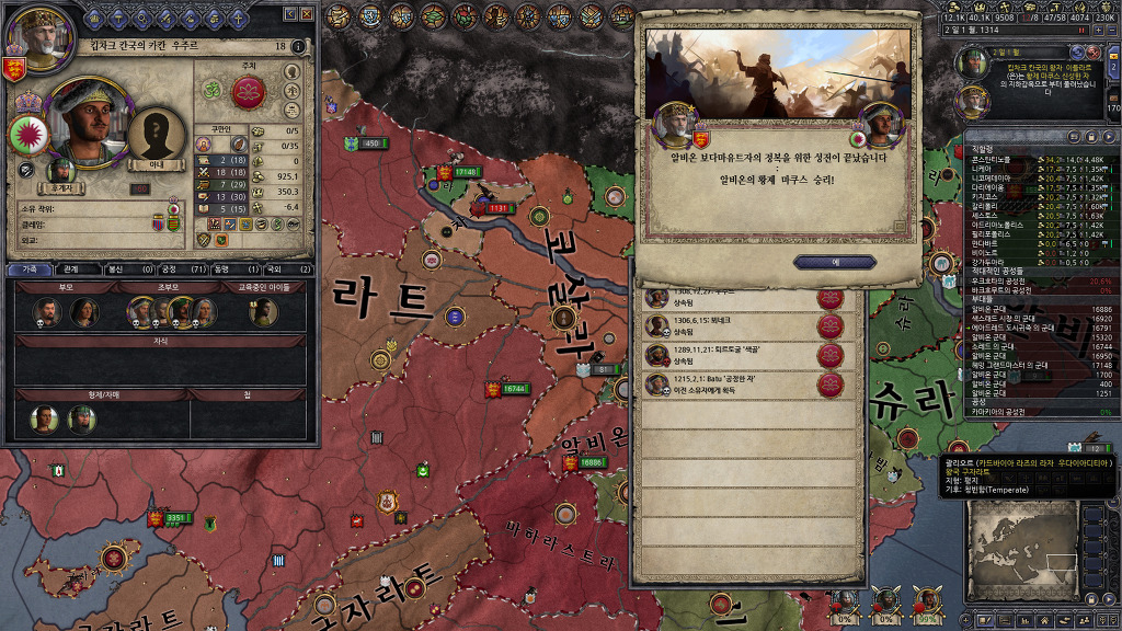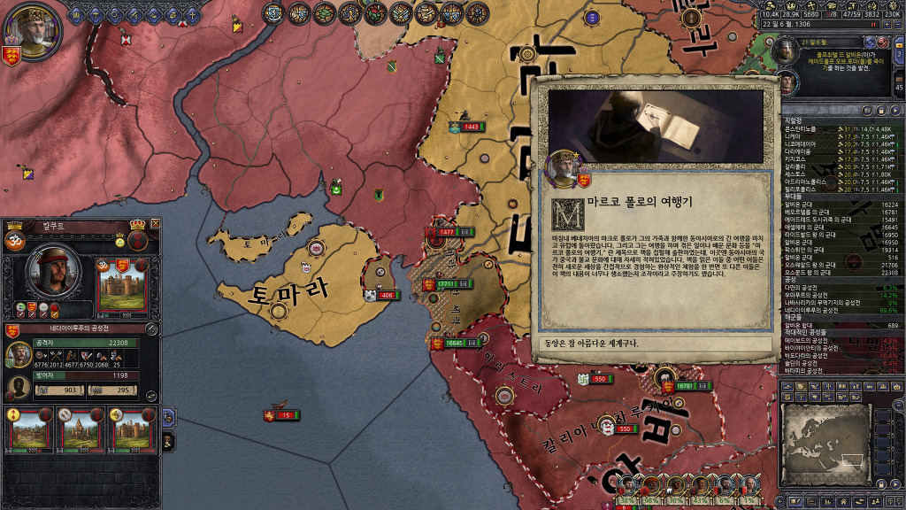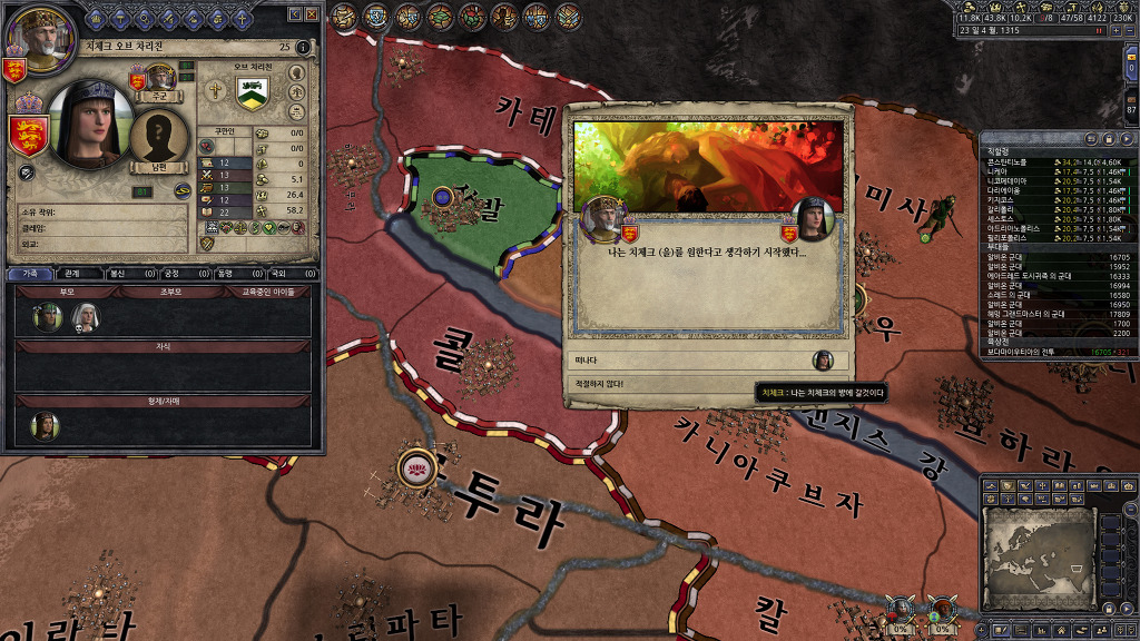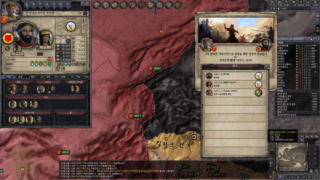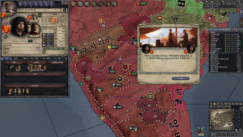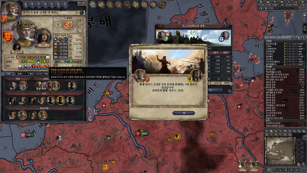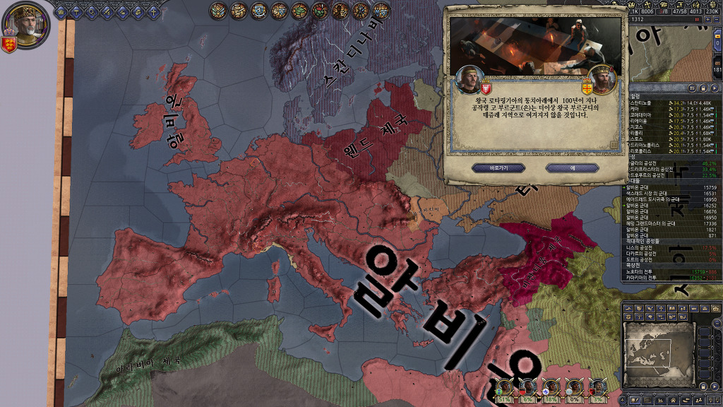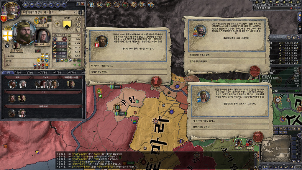 정복에 열중해서 못 보고 지나간건지, 아니면 관심사를 음모로 바꾸어서 알려주지 않은건지는 모르겠지만, 팝업창을 본 기억이 없는데, 알려진 살해자 패널티를 받고 있었군요.... 누굴 암살했더라...??? 종종 전쟁을 치르지 않고 있는 세력을 확인하여 휴전기간인지 확인해보고 전쟁을 반복하고 있었기 때문에 눈치를 못채고 있었네요...