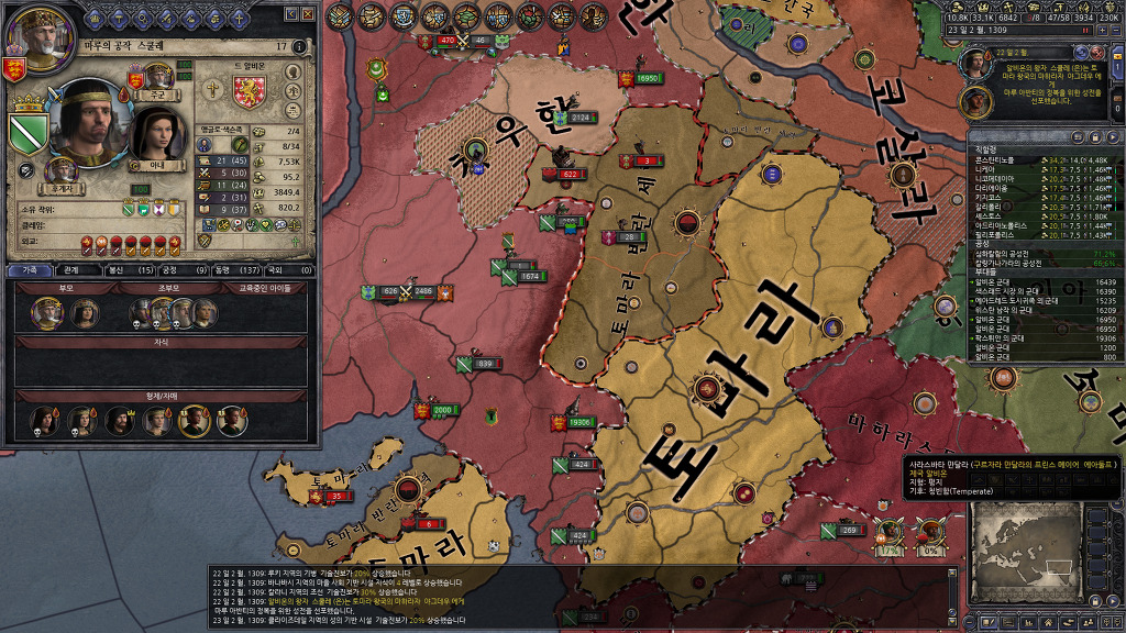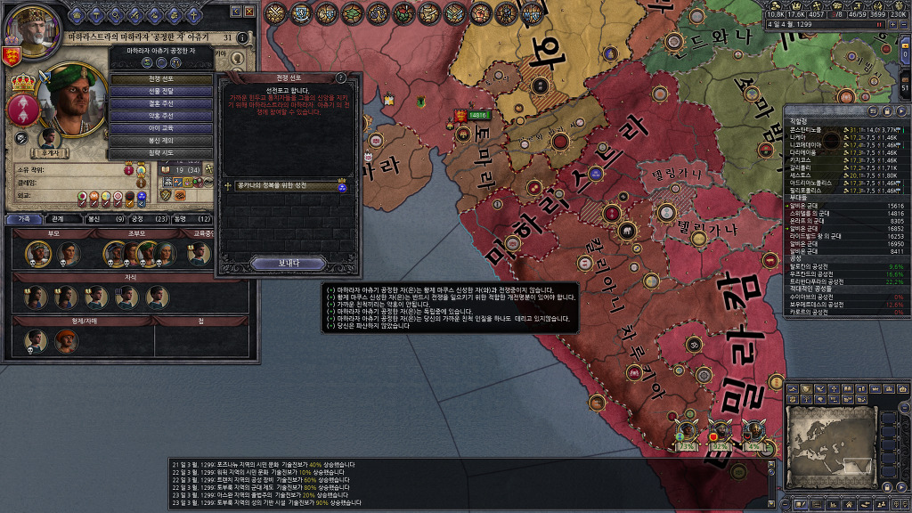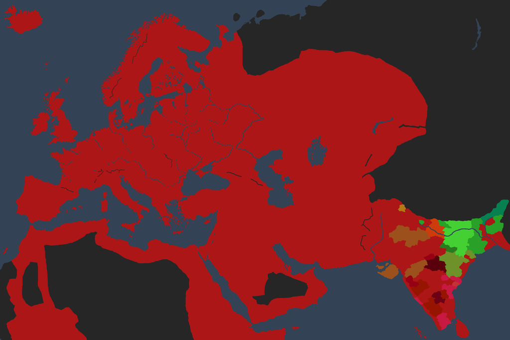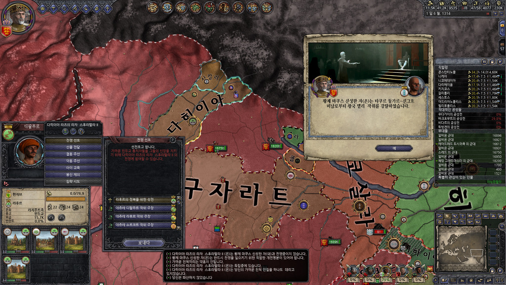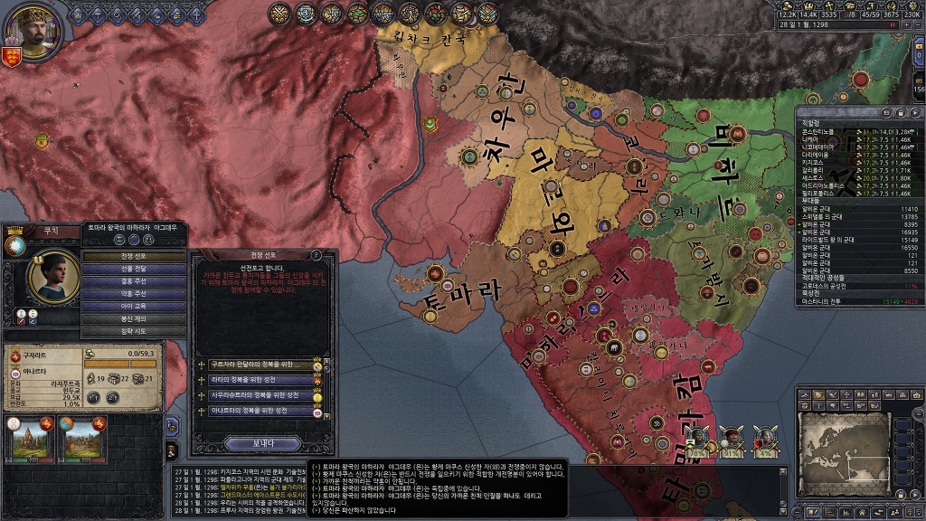 성전을 걸때 되도록 새로운 국가와 국경을 접할 수 있는 공작령을 우선하다보니, 인도 지도가 지저분해지긴 했습니다만, 남동쪽의 실론섬도 절반을 점령하였고, 북독쪽의 뱅골에도 진출하는데 성공했네요.
