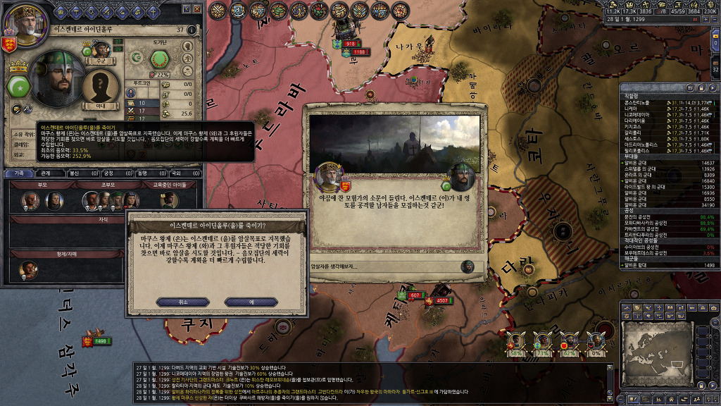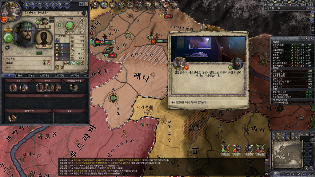 관심사를 암살로 바꾸고 첩보관을 파견하여 휴전기간인 인도 군주중 암살 확률이 가장 높게 나타나는 인물의 암살 시도를 반복하고 있었습니다만... 두명 밖에 암살하지 못했군요.