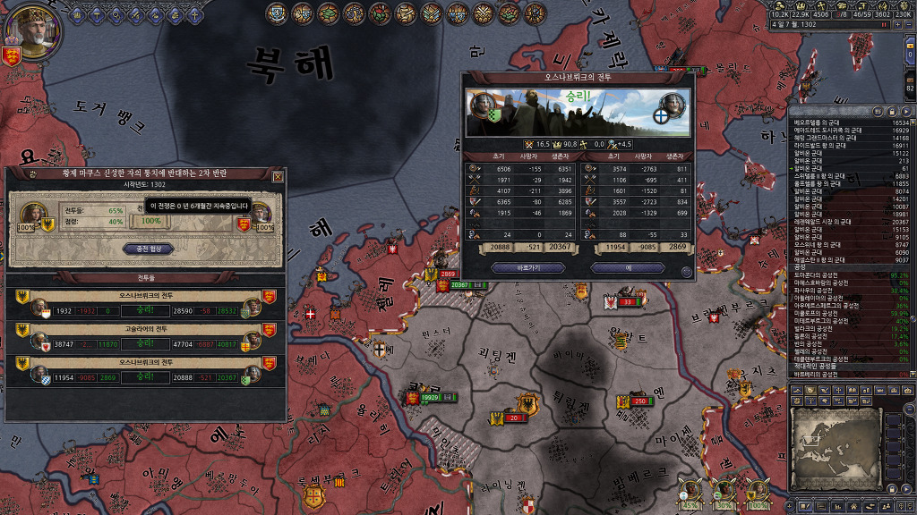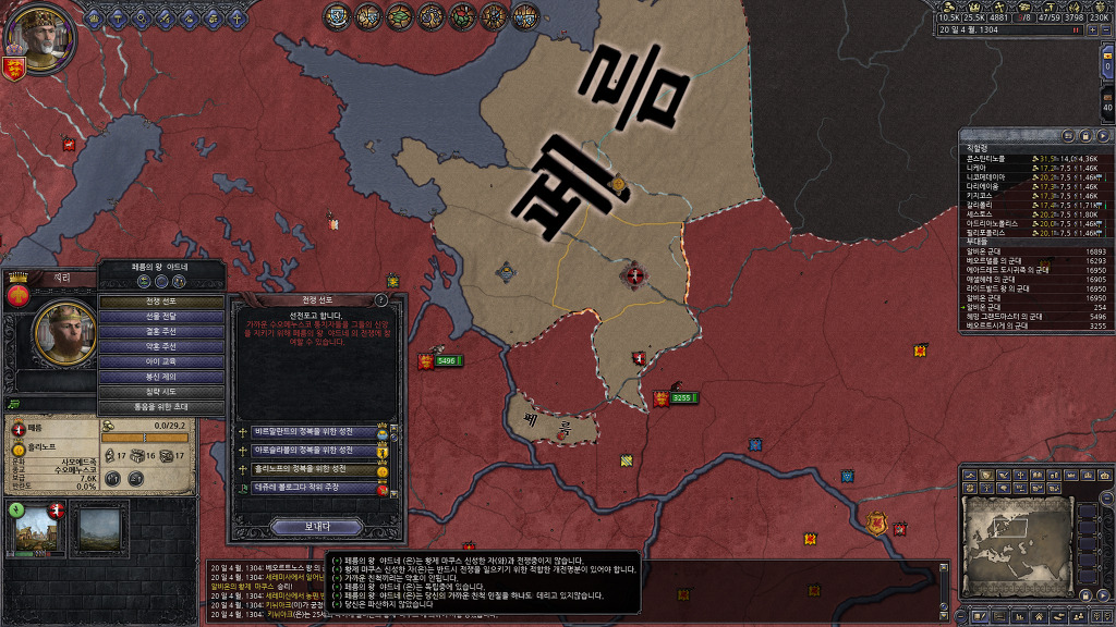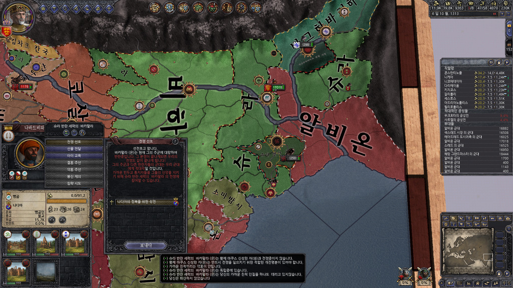 다시 반란이 발생하였군요. 반란 세력중 하나는 공작령을 온전히 차지하고 있지 못하기에 무시하고, 공작령 하나를 완전히 장악하고 있는 반란군에게 성전을 걸어 줍니다.