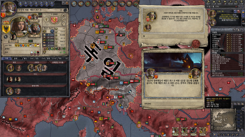 독일과 잉글랜드가 합쳐지는걸 볼 수는 없으니, 독일의 여왕 에알드쥐스 2세를 파문-투옥 신공을 활용하여 반란을 유도해줍니다.