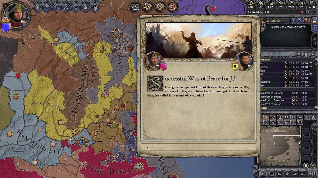 154년이 지났지만 아직도 황건적이 잘나간다는 게 유머 ㅋㅋㅋㅋㅋㅋ 대성전 기능 넣어주자마자 바로 한 건 터뜨려 주는군요! 이 모드에서 대성전이 가능한 건 유교의 Imperial Decree와 태평도의 Way of Peace 뿐인데 유교는 영 비실비실하니 안습 ㅋㅋㅋㅋ