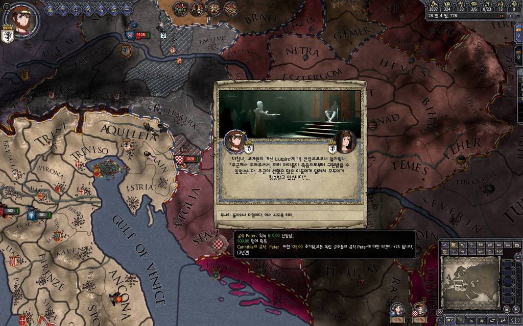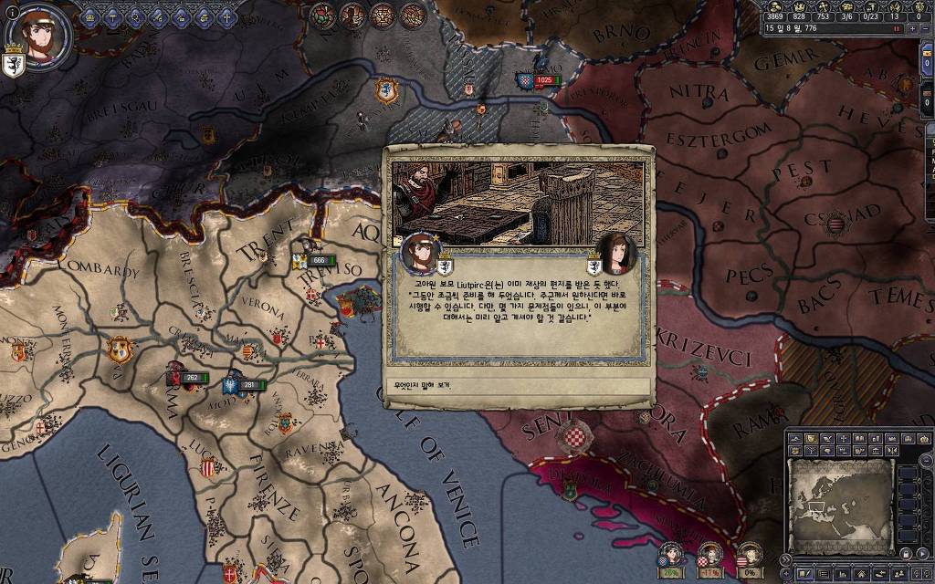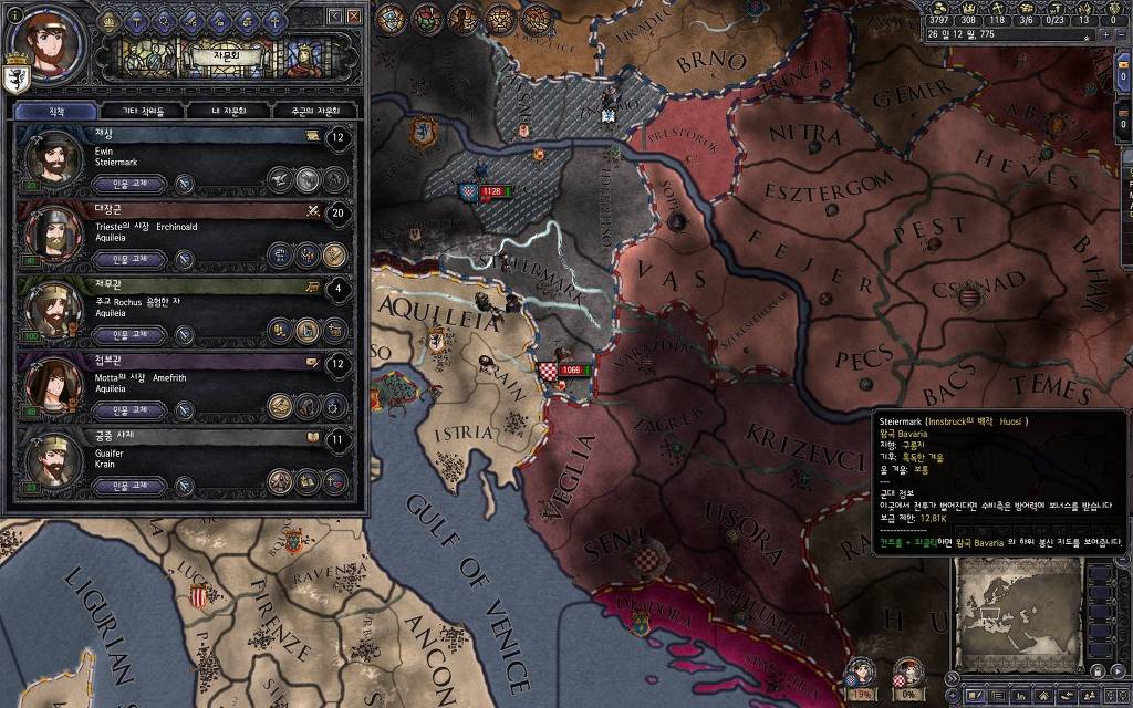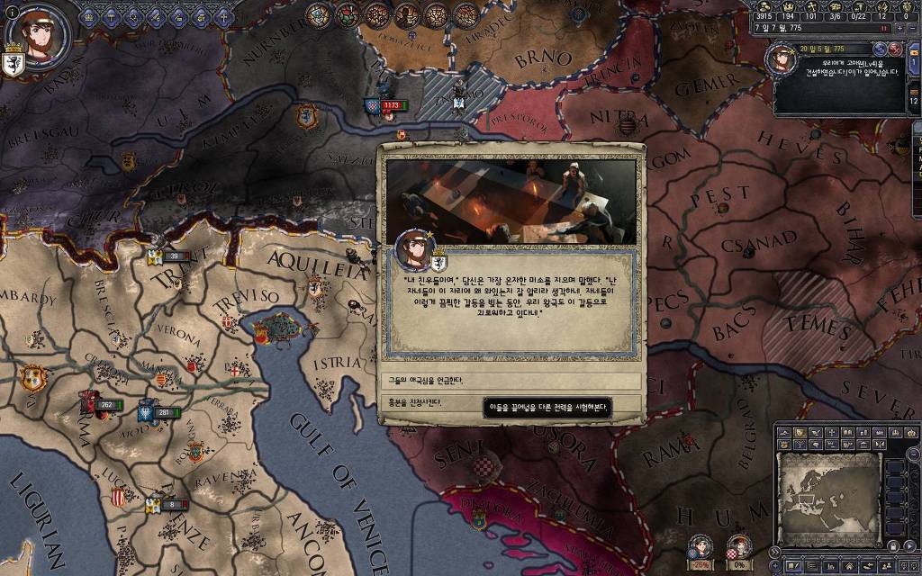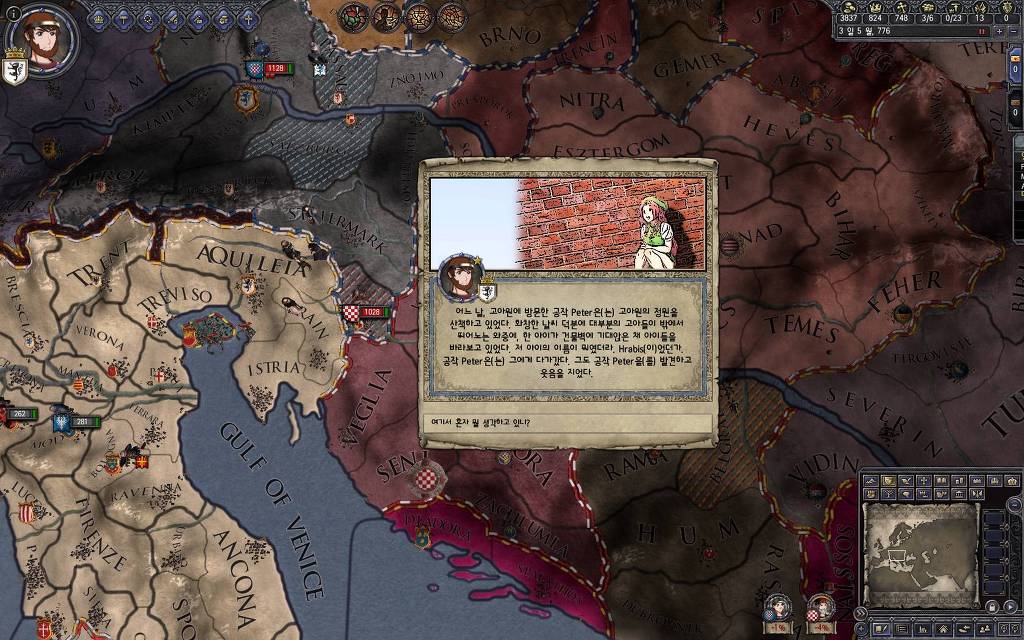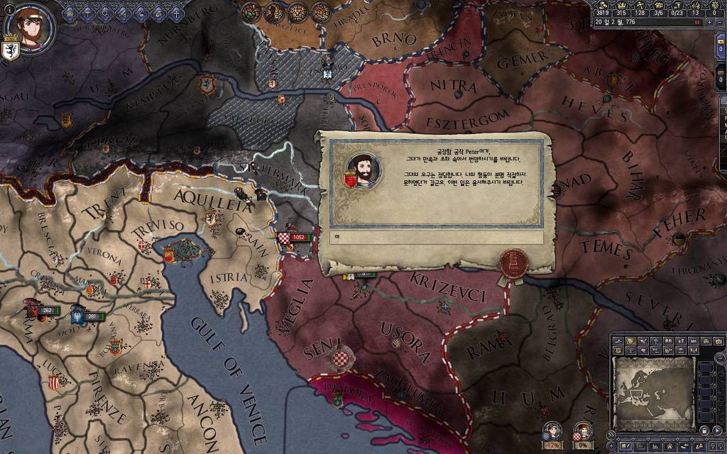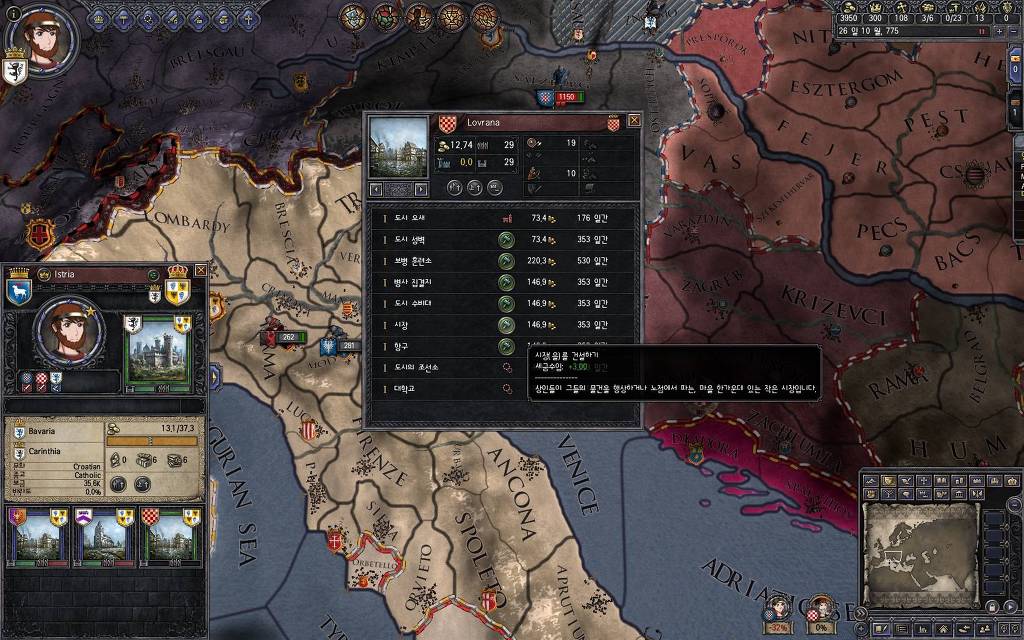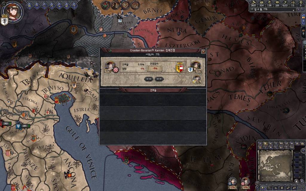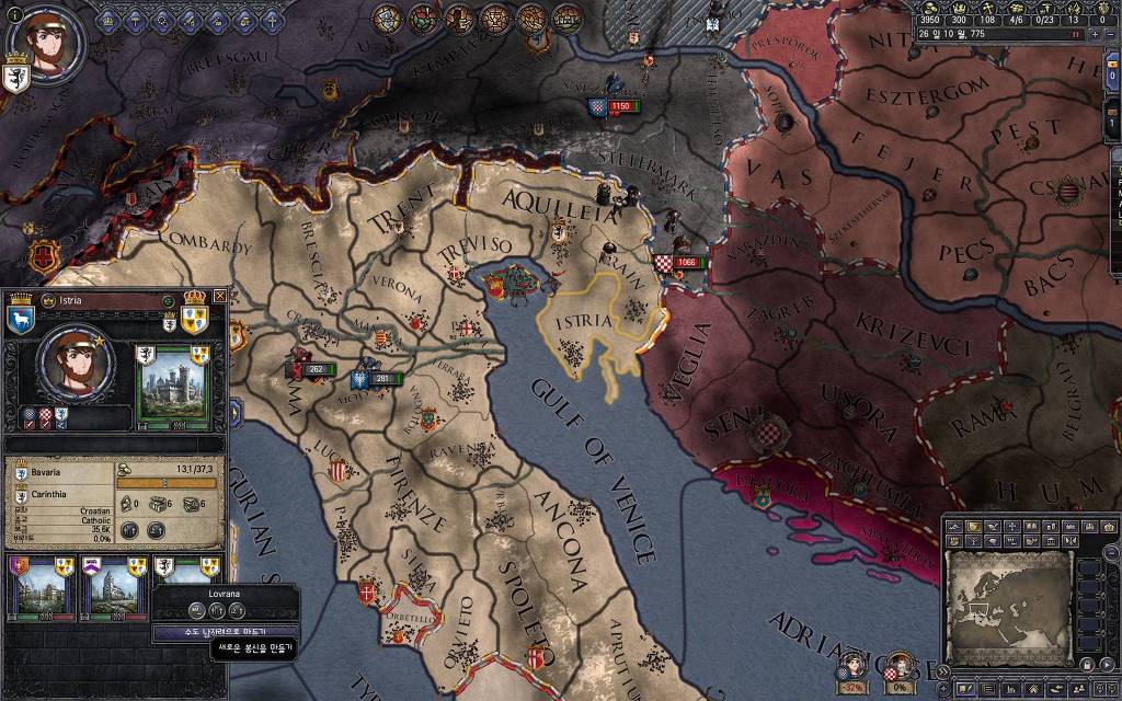 지금 윗동네 바바리아 왕국은 끝도 없이 전쟁이 계속되고 있습니다. 이 전쟁은 은근히 크로아티아 왕을 응원 중인데(우리 주군께서 방어측에 참전해 계시다는 게 개그 포인트), 옆 크로아티아 왕이 바바리아 왕을 상대로 Karnten 을 내놓으라는 전쟁을 하고 있어요. 지금 바바리아 왕하고는 휴전 기간이라서 전쟁을 못 하고 있는데, 크로아티아 왕이 낼름 가져가 준다면 전 크로아티아 왕을 상대로 클레임을 주장하는 전쟁을 바로 시작할 수 있으니까요. 근데 워낙 전쟁이 지지부진해서, 이러다가 10년 지나지 않을까 싶기도 합니다.