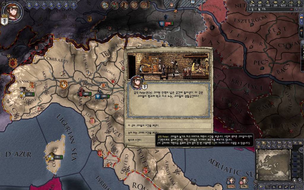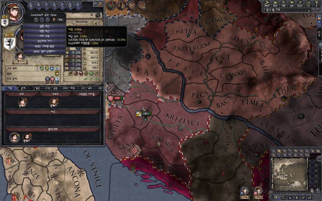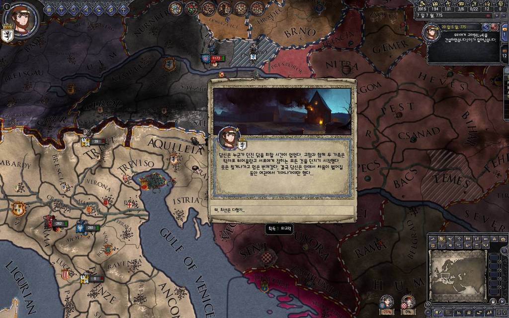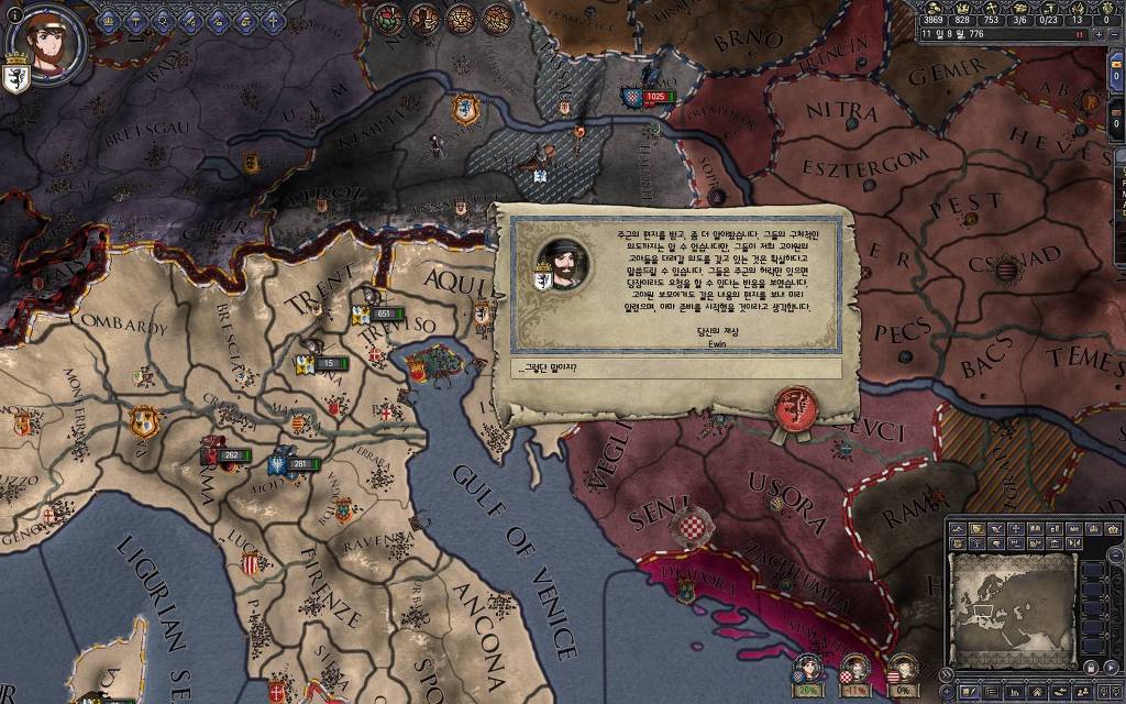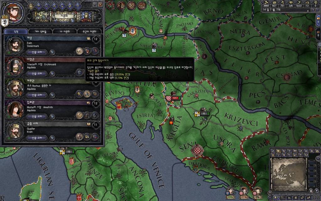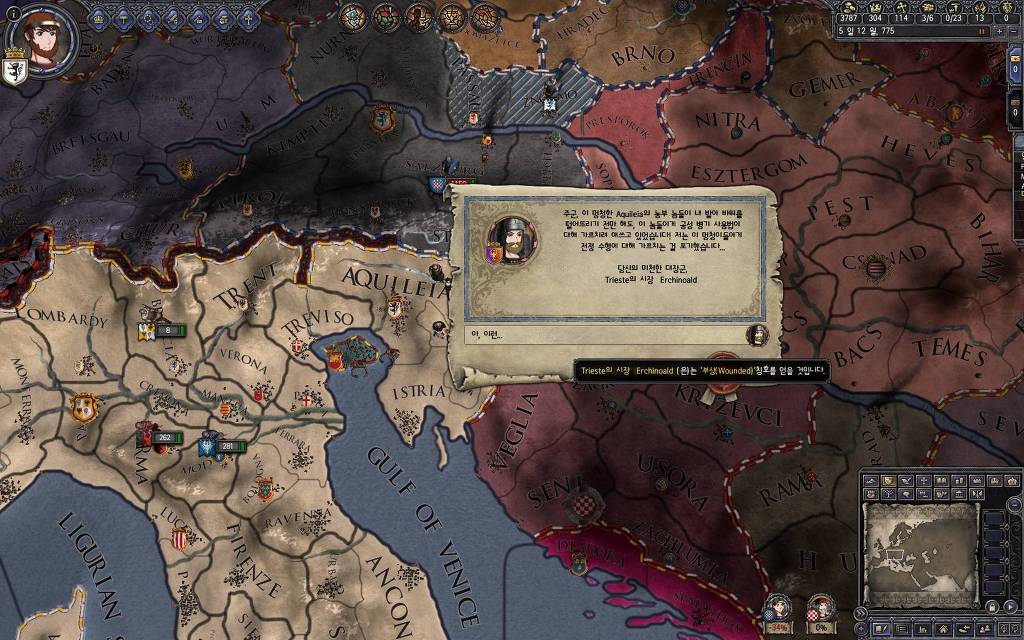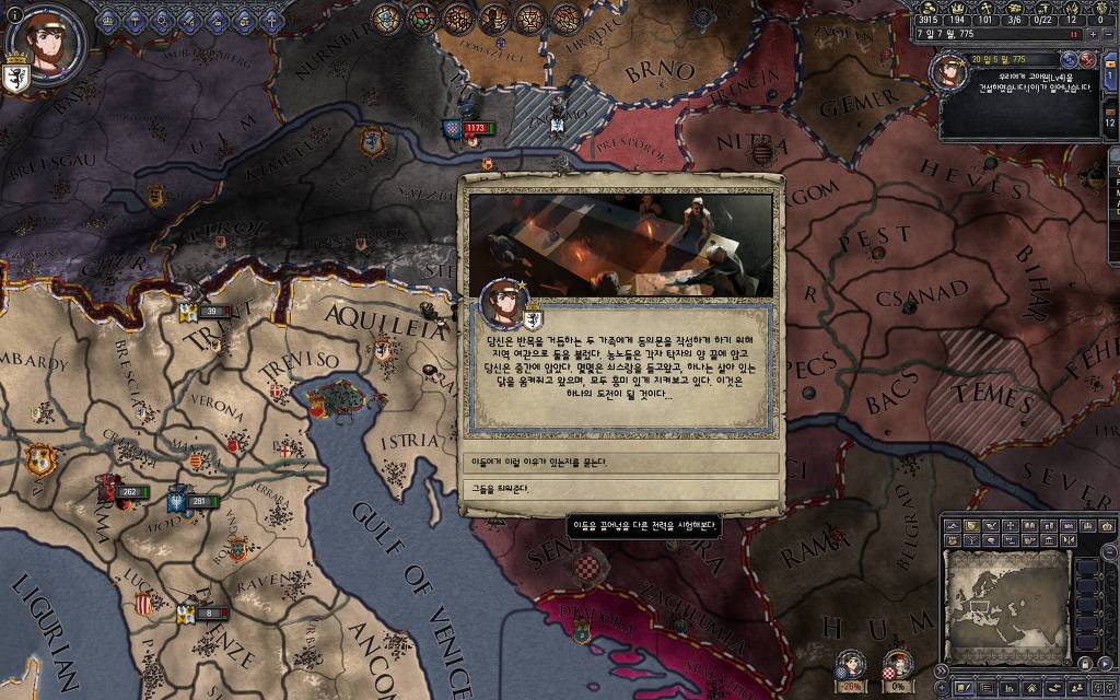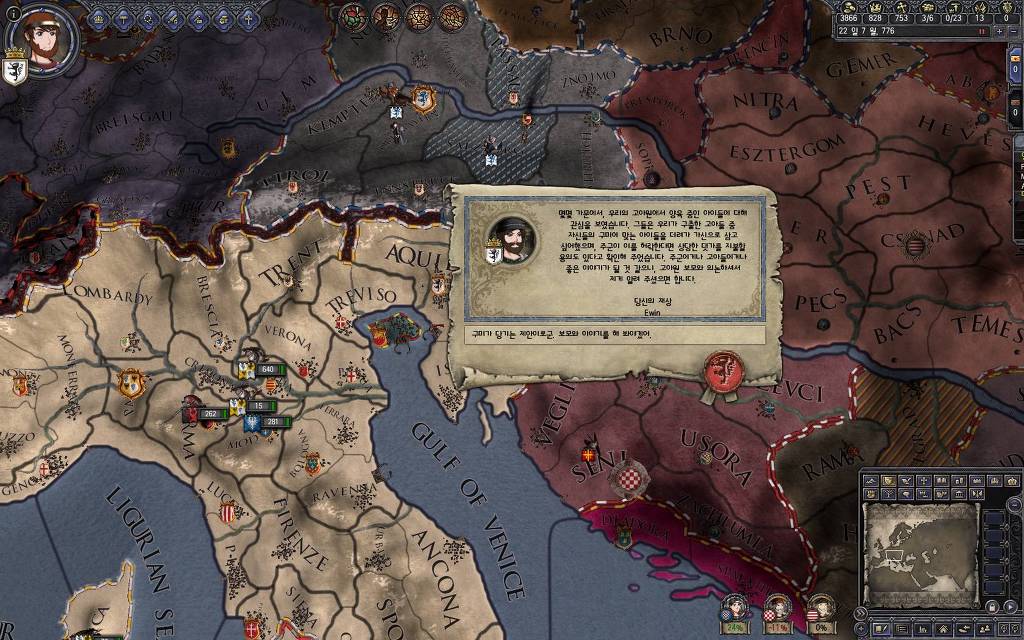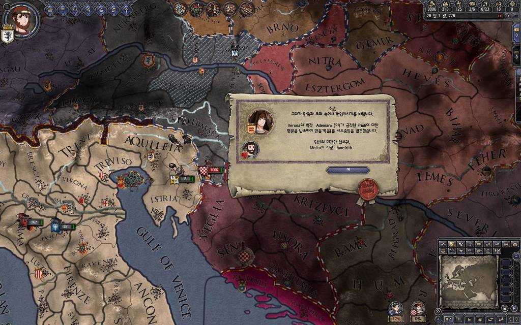 지금 윗동네 바바리아 왕국은 끝도 없이 전쟁이 계속되고 있습니다. 이 전쟁은 은근히 크로아티아 왕을 응원 중인데(우리 주군께서 방어측에 참전해 계시다는 게 개그 포인트), 옆 크로아티아 왕이 바바리아 왕을 상대로 Karnten 을 내놓으라는 전쟁을 하고 있어요. 지금 바바리아 왕하고는 휴전 기간이라서 전쟁을 못 하고 있는데, 크로아티아 왕이 낼름 가져가 준다면 전 크로아티아 왕을 상대로 클레임을 주장하는 전쟁을 바로 시작할 수 있으니까요. 근데 워낙 전쟁이 지지부진해서, 이러다가 10년 지나지 않을까 싶기도 합니다.