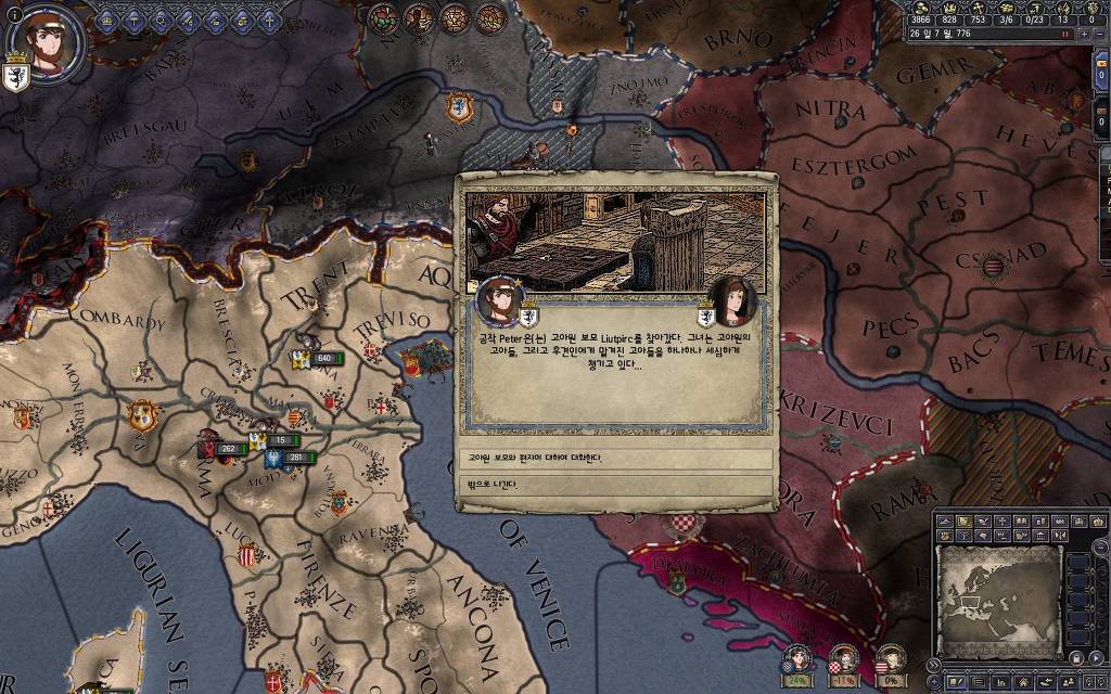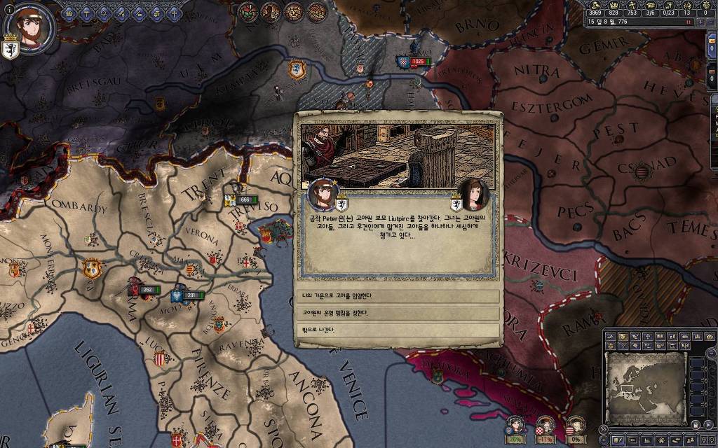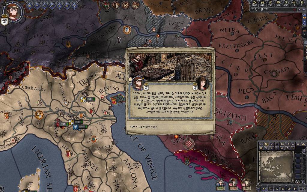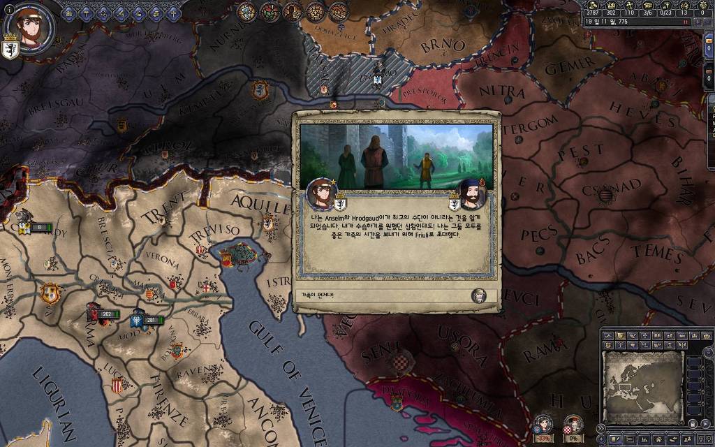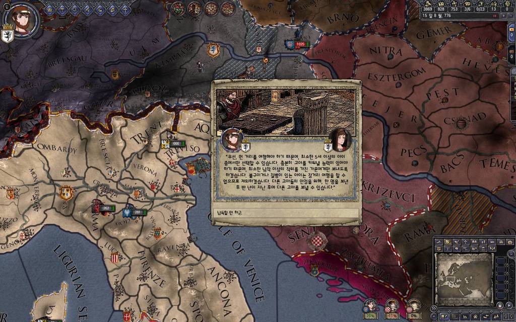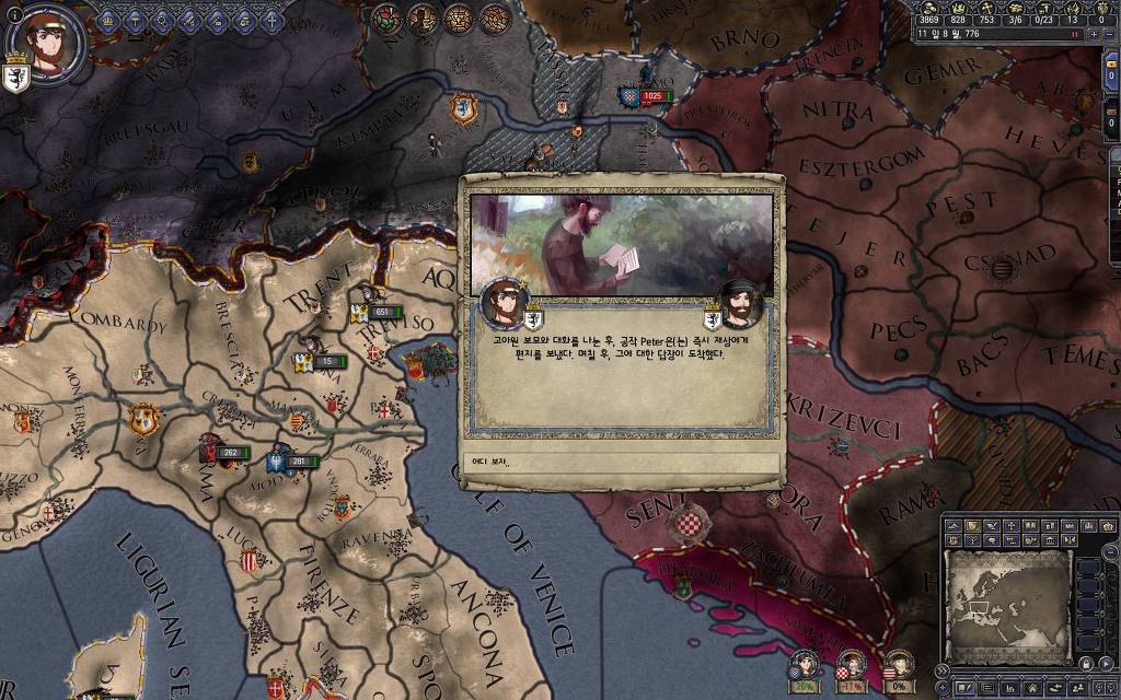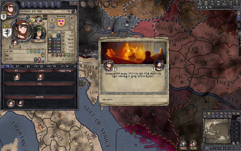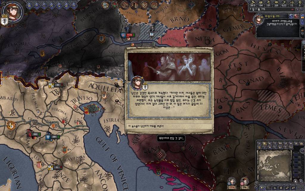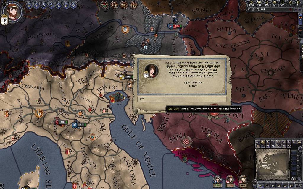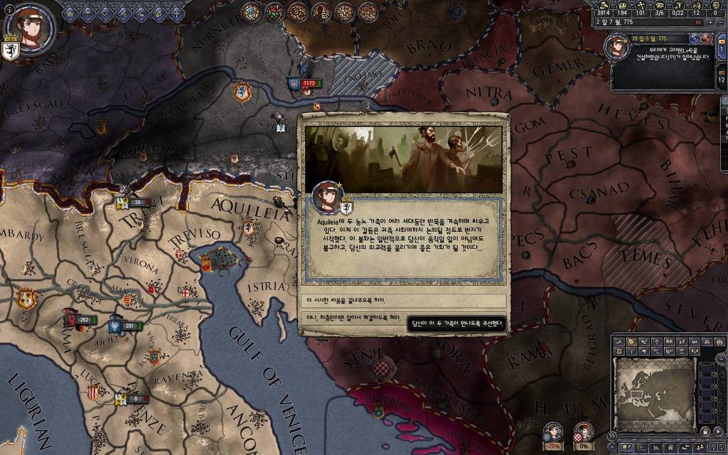 지금 윗동네 바바리아 왕국은 끝도 없이 전쟁이 계속되고 있습니다. 이 전쟁은 은근히 크로아티아 왕을 응원 중인데(우리 주군께서 방어측에 참전해 계시다는 게 개그 포인트), 옆 크로아티아 왕이 바바리아 왕을 상대로 Karnten 을 내놓으라는 전쟁을 하고 있어요. 지금 바바리아 왕하고는 휴전 기간이라서 전쟁을 못 하고 있는데, 크로아티아 왕이 낼름 가져가 준다면 전 크로아티아 왕을 상대로 클레임을 주장하는 전쟁을 바로 시작할 수 있으니까요. 근데 워낙 전쟁이 지지부진해서, 이러다가 10년 지나지 않을까 싶기도 합니다.