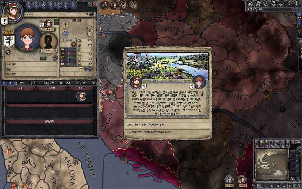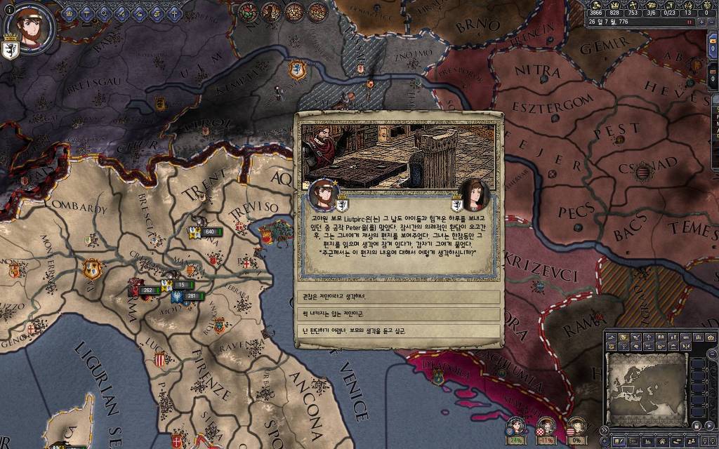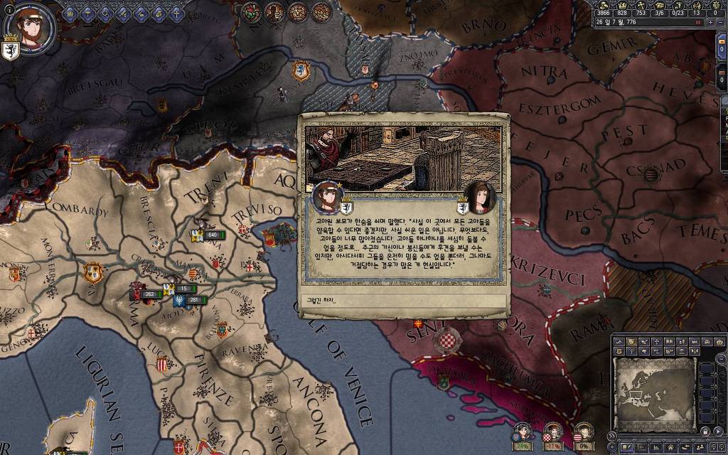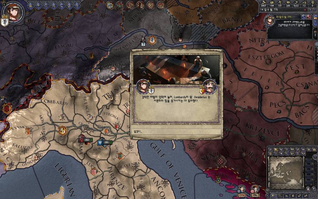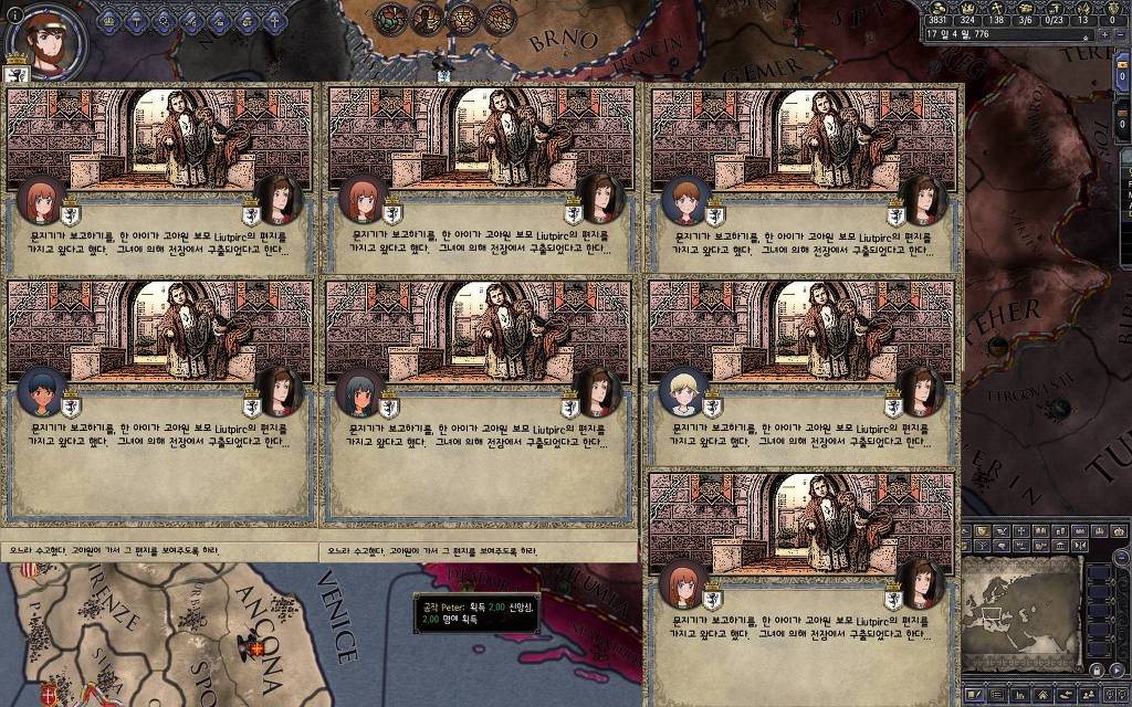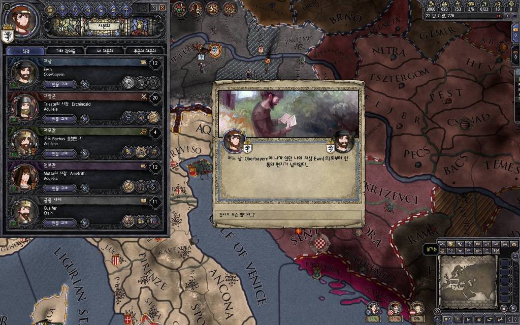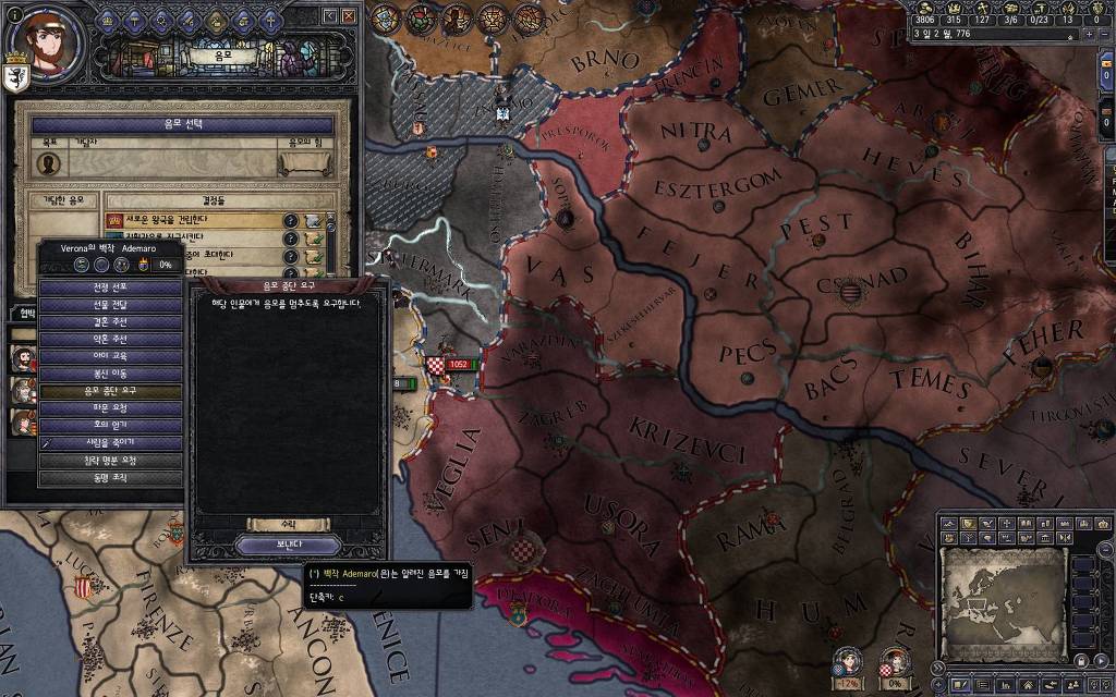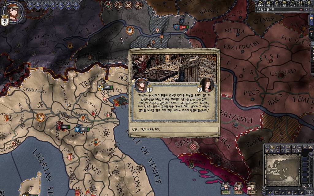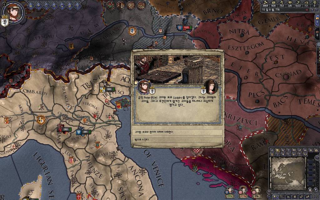지금 윗동네 바바리아 왕국은 끝도 없이 전쟁이 계속되고 있습니다. 이 전쟁은 은근히 크로아티아 왕을 응원 중인데(우리 주군께서 방어측에 참전해 계시다는 게 개그 포인트), 옆 크로아티아 왕이 바바리아 왕을 상대로 Karnten 을 내놓으라는 전쟁을 하고 있어요. 지금 바바리아 왕하고는 휴전 기간이라서 전쟁을 못 하고 있는데, 크로아티아 왕이 낼름 가져가 준다면 전 크로아티아 왕을 상대로 클레임을 주장하는 전쟁을 바로 시작할 수 있으니까요. 근데 워낙 전쟁이 지지부진해서, 이러다가 10년 지나지 않을까 싶기도 합니다.