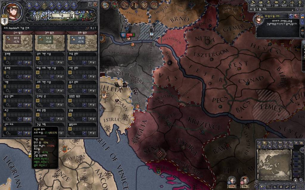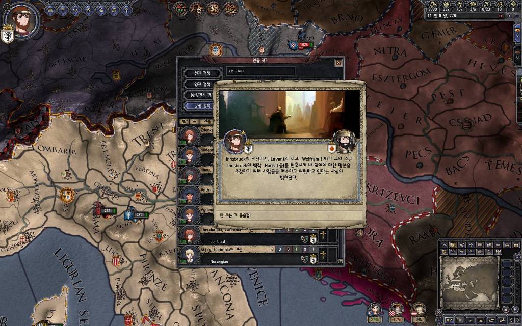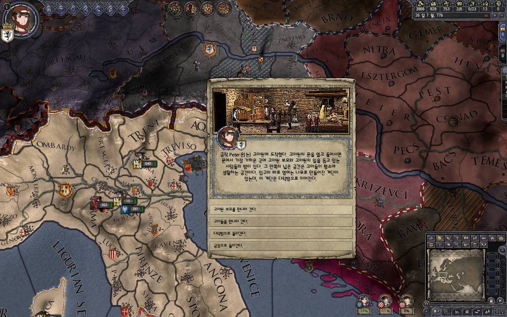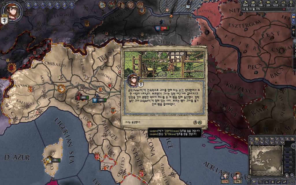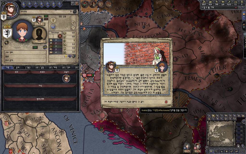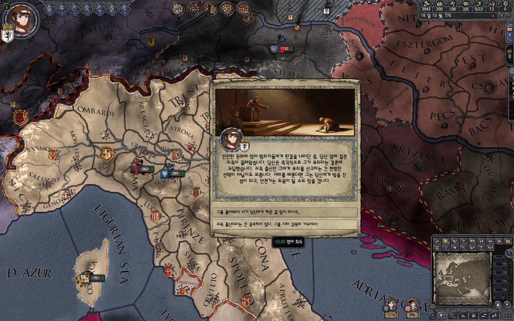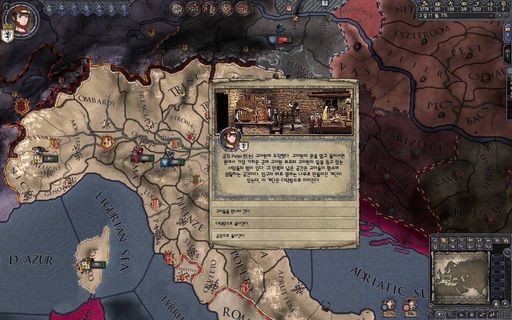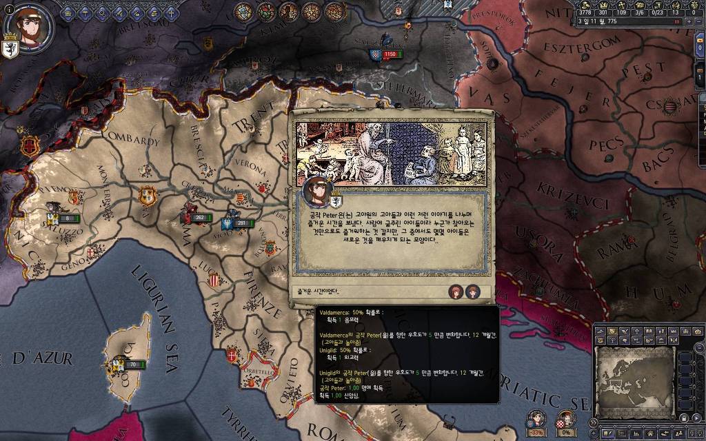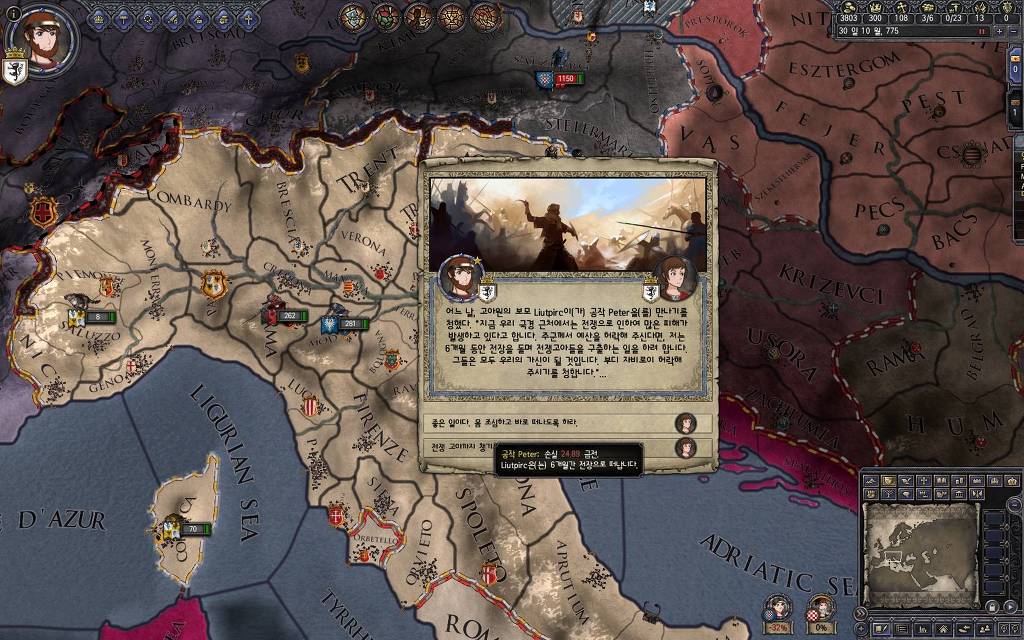 지금 윗동네 바바리아 왕국은 끝도 없이 전쟁이 계속되고 있습니다. 이 전쟁은 은근히 크로아티아 왕을 응원 중인데(우리 주군께서 방어측에 참전해 계시다는 게 개그 포인트), 옆 크로아티아 왕이 바바리아 왕을 상대로 Karnten 을 내놓으라는 전쟁을 하고 있어요. 지금 바바리아 왕하고는 휴전 기간이라서 전쟁을 못 하고 있는데, 크로아티아 왕이 낼름 가져가 준다면 전 크로아티아 왕을 상대로 클레임을 주장하는 전쟁을 바로 시작할 수 있으니까요. 근데 워낙 전쟁이 지지부진해서, 이러다가 10년 지나지 않을까 싶기도 합니다.