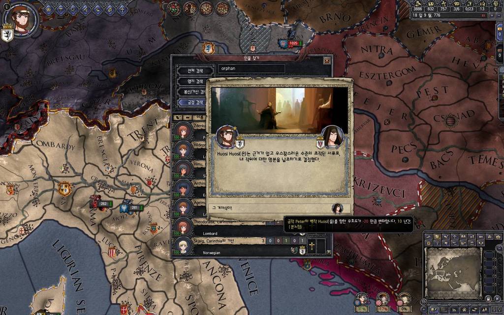 어느 새 6개월이 지나고, 고아원 보모가 무사히 돌아왔습니다. 이처럼 신앙심과 명예를 대량으로 얻을 수 있고, 모든 독립 군주들의 플레이어에 대한 우호도가 25 증가(3년간)합니다. 특기할 것은, 위협(악명, Infamy)가 -25 된다는 점입니다. 따라서 위협 수치를 줄이는 데도 사용은 가능합니다. 다만, 고아원 보모의 종군은 5년이 쿨 타임이라.. 자주 쓸 수는 없어요. 혹시 고아원 보모를 교체해 가면서 계속 돌려막기(..)를 할 생각이시라면.. 한 번 잘린 보모는 다시 임명이 안 된다는 사실을 꼭 알아 두시기 바랍니다. ^^ 가능은 합니다.