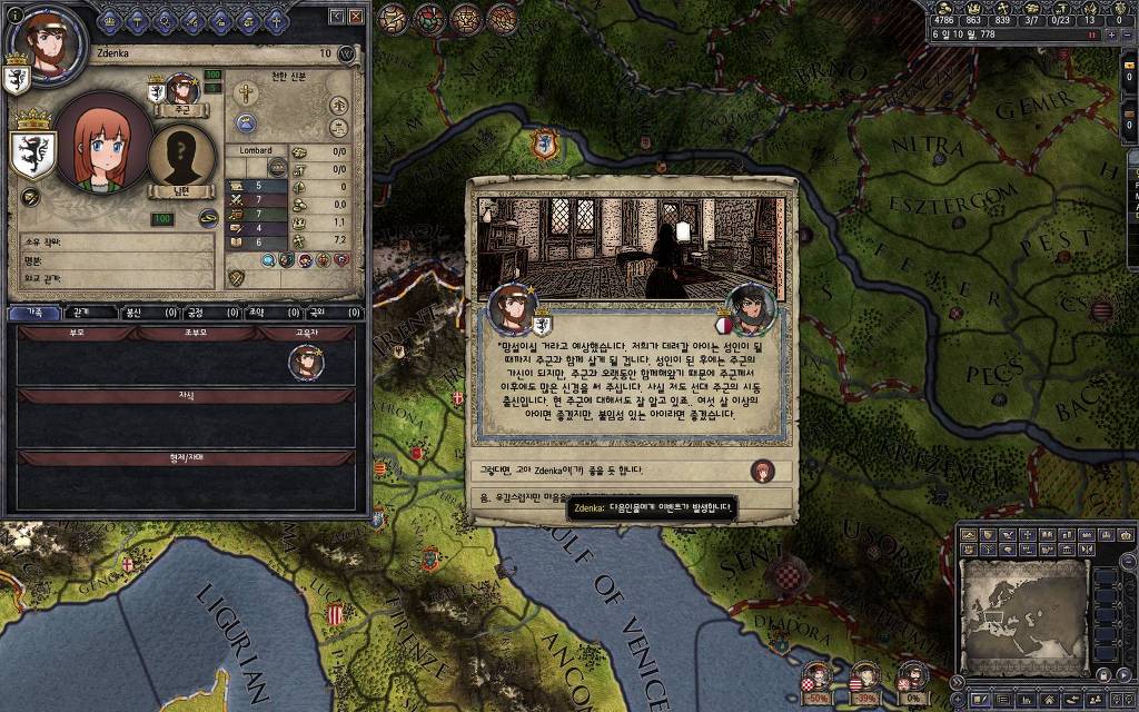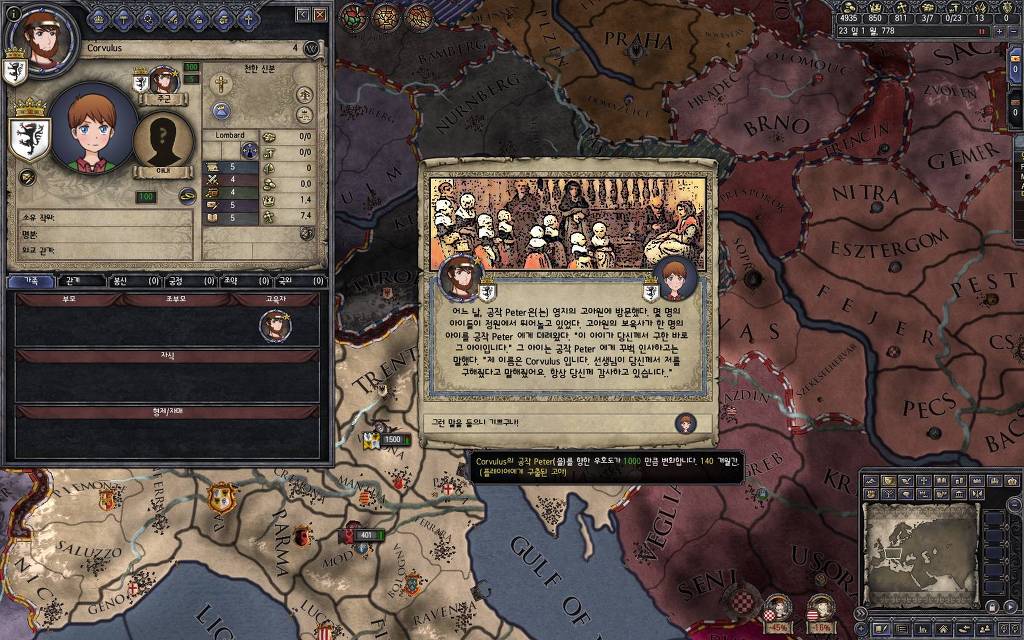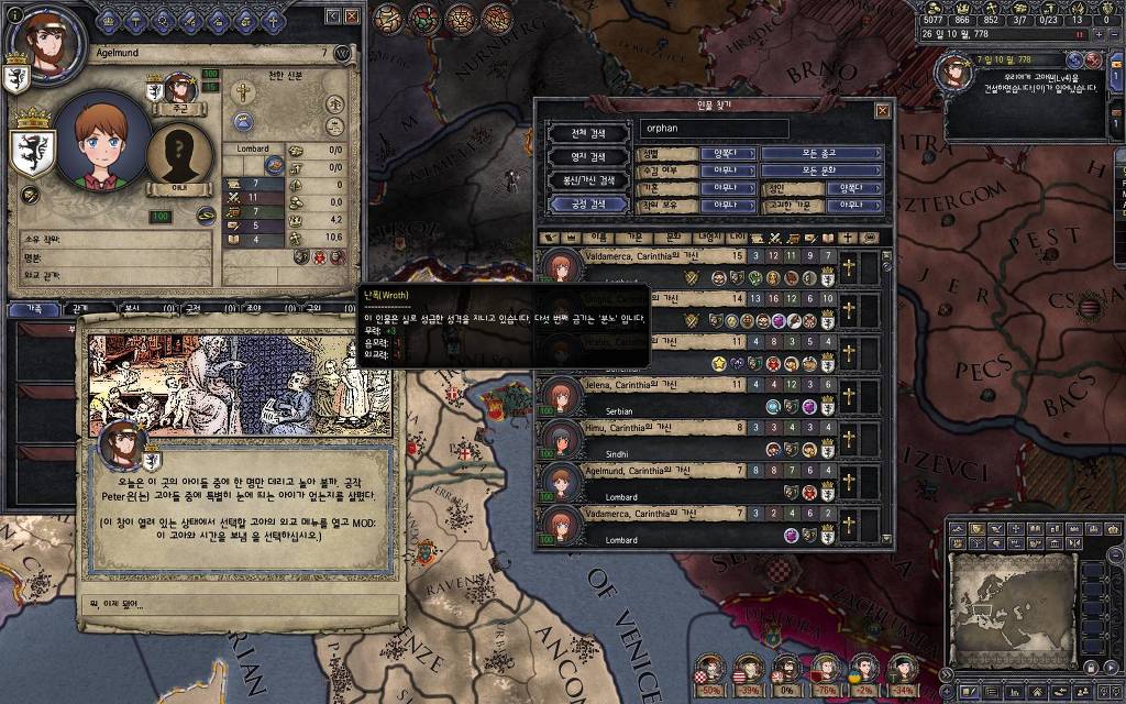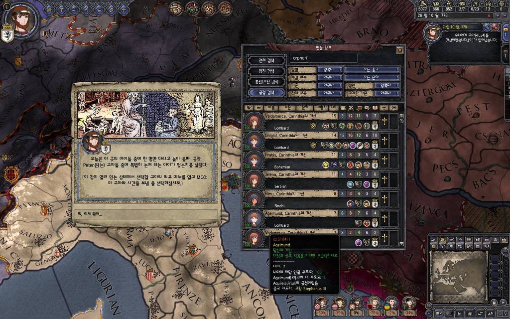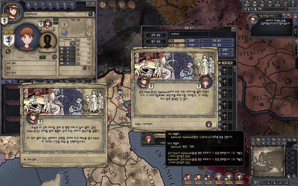 지난 5월 15일 버전에서 추가했던 이벤트입니다. 고아를 다른 군주에게 보내는 이벤트를 안 쓰고 있다 보면, 이런 식으로 오히려 상대 군주들이 고아를 데려가겠다며 찾아오는 경우가 발생합니다. 한번 어떤 눔이 왔는지 가 보도록 하겠습니다.