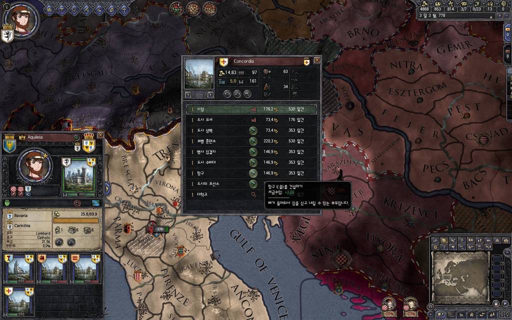 그리고, 새로 만든 도시에 시장이 완성되었으니, 항구도 마저 눌러주겠습니다. 시장과 항구 정도는 만들어 줘야 세금 걷기 좋죠.