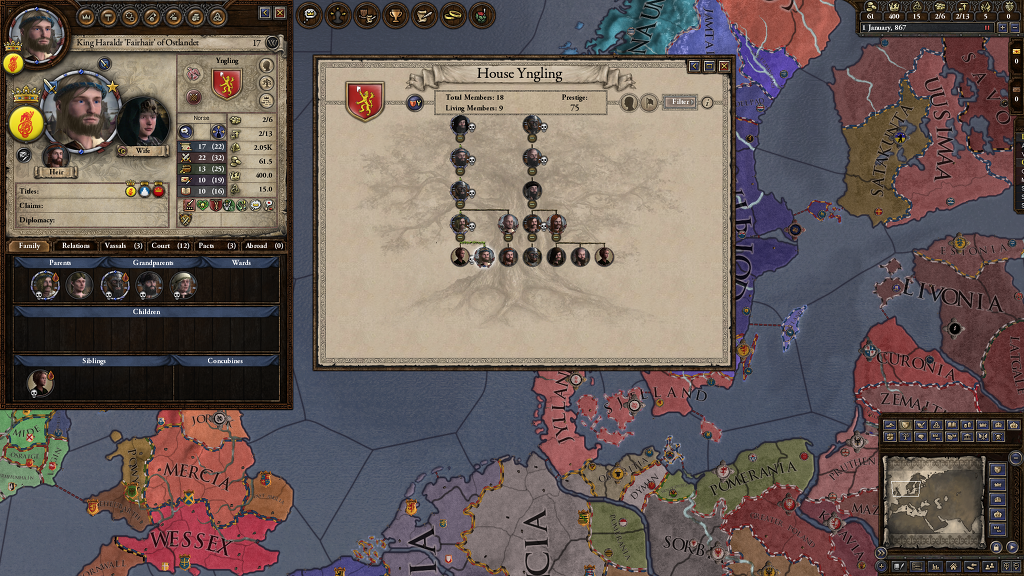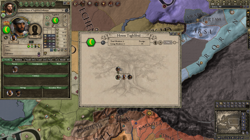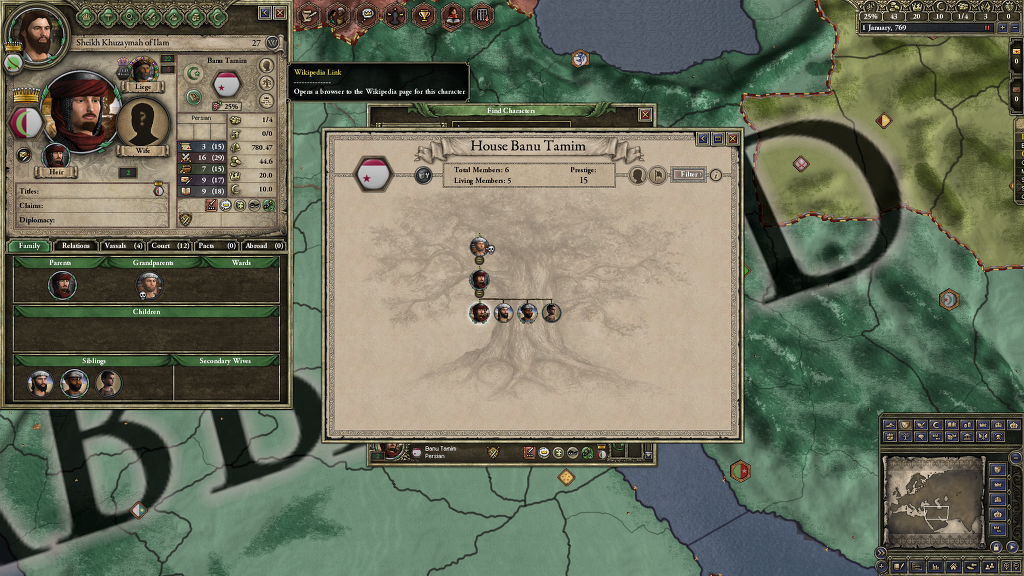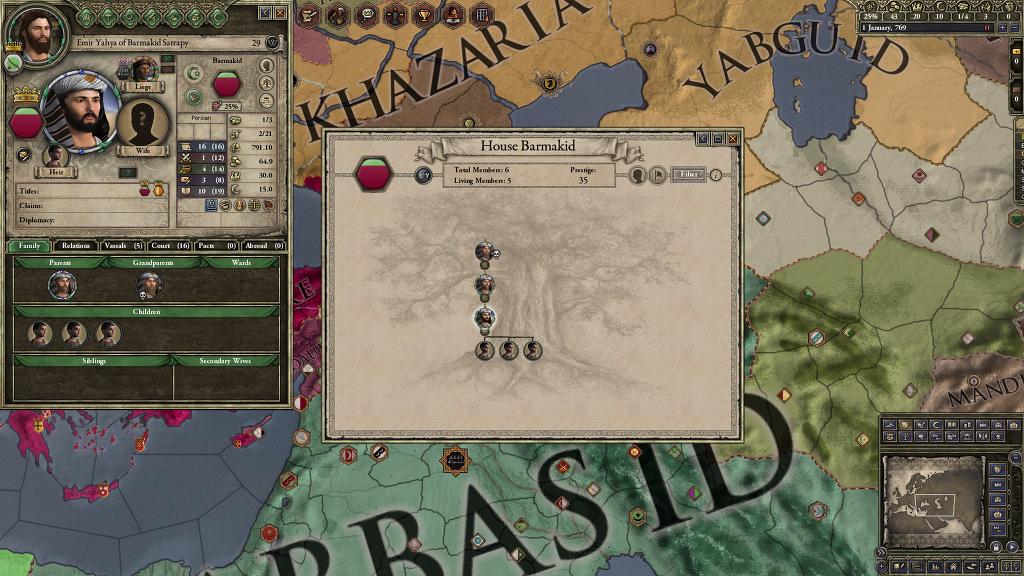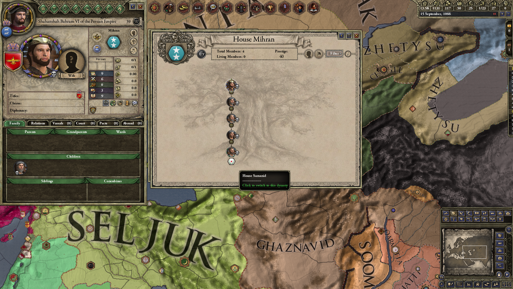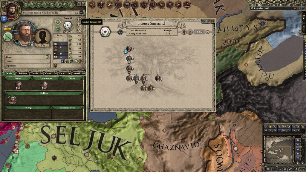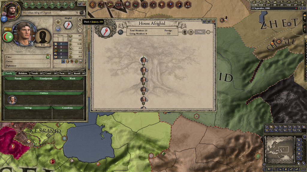 토탈 워: 아틸라에도 나오는 유서 깊은 가문입니다만, 보시다시피 1066년 이후에는 대가 끊겨 있습니다. 그 전에는 우르겐치 백작으로 계속 살고 계십니다. 우르겐치의 백작에서 히바의 왕이, 히바의 왕에서 페르시아의 왕중왕이 되는 긴 여정을 한 번 해봅시다.