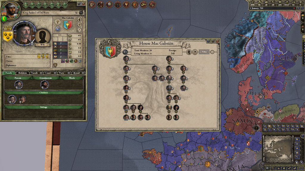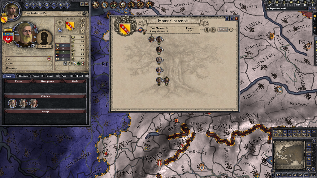 769년으로 하면 고난이도 가문이 되는데 가장 큰 문제가 파리 백작이라는 겁니다. 샤를마뉴가 승리하든 카를로만이 승리하든 둘은 보통 서 프랑크를 메인 작위로 설정하는데 문제는 프랑스의 수도가 파리이기 때문에... 어떻게든 수도를 빼앗으려드는 AI 시스템 상 약해빠진 백작이 파리를 안 뱉어내는 건 사실상 불가능합니다. 그래도 가문 문장이 멋있어서 매력적이에요.