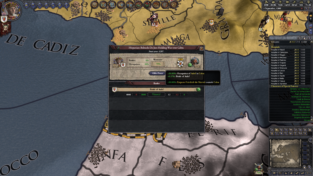 그리고 3년이라는 세월이 흐르는 동안 1. 프랑스를 격파해서 루시용을 정복, 2. 예루살렘술탄을 격파하고 로도스를 정복, 3. 노르웨이를 격파하고 비스카야의 홀딩을 회수했습니다.