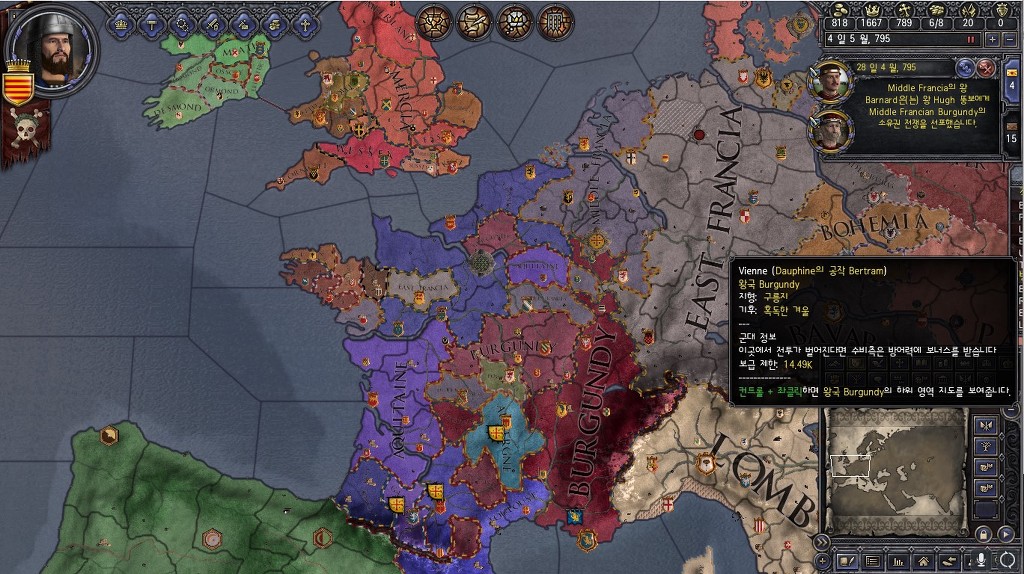 어떻게 된건지 도저히 추적이 안되는 상황에서 어버버 거리는사이에 각 왕국의 공작놈들이 북구놈들 아래에선 지낼 수 없다며 대규모 독립파벌 만들어서 독립해버리는 바람에 프랑스 전 지역은 전국시대가 열렸습니다.