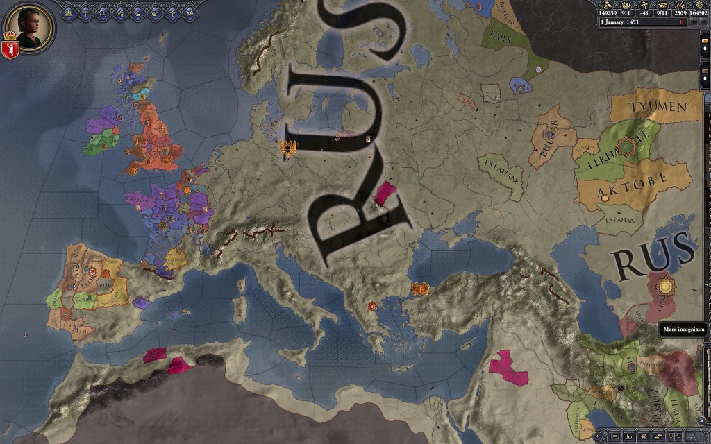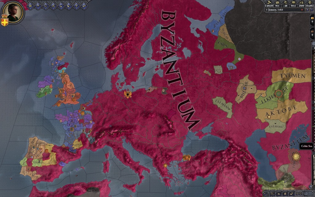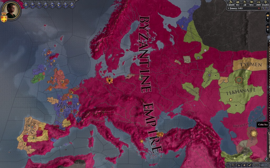 얘가 1452년에 위의 아버지가 자살한 뒤(자살이 아니라 일부러 암살실패를 한것입니다만) 어머니를 암살하고(!) 러시아를 흡수한 마지막 군주입니다. 이왕 천자를 끼고 플레이하는 김에 신롬황제도 북해 구석탱이에 박아놓고 살려만 두었습니다(멸망시키고 황제를 먹을 수 있나 했는데 멸망시켜도 제국생성이 안되더군요 ㅡㅡ; 왜일까) 트레잇은 쌍둥이랑 attractive라서 1/0/0/0/0 사상 최약의 군주네요. 저 비잔티움 제국을 한꺼풀만 벗겨보면?