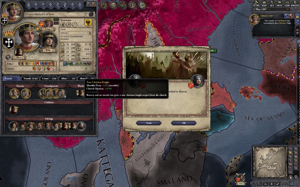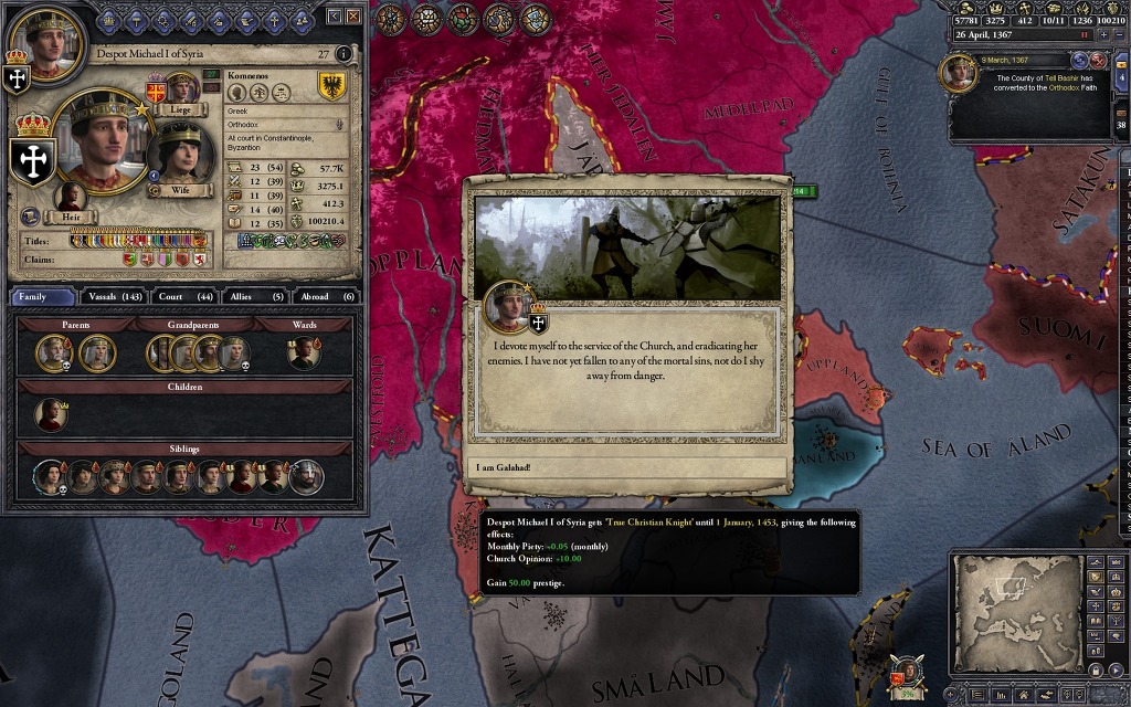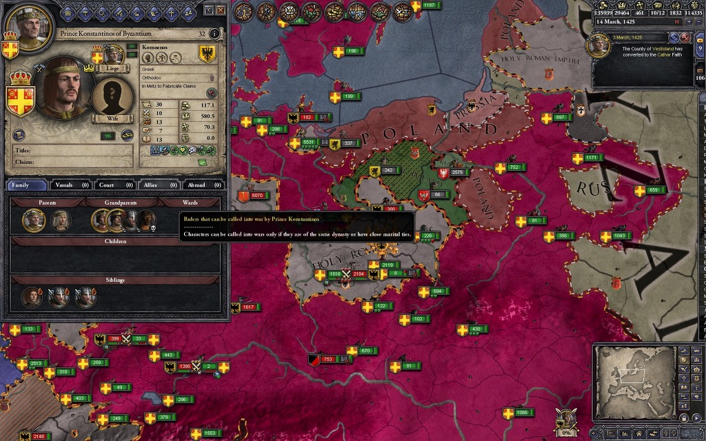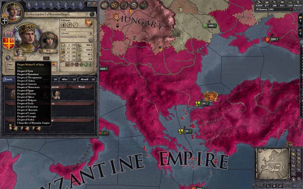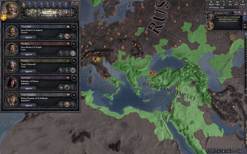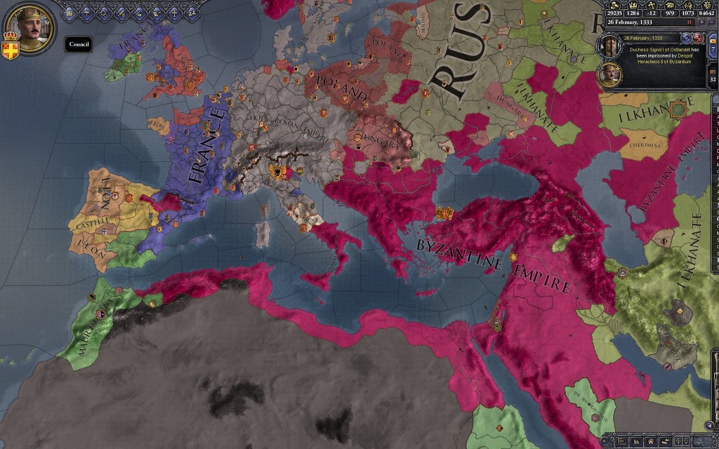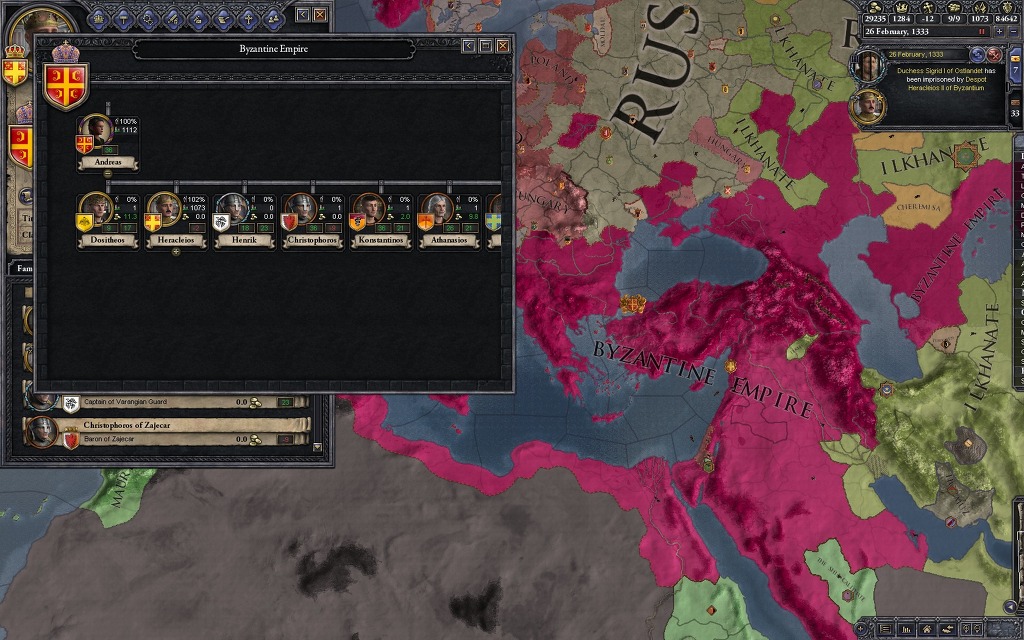 아니 뭘 하려고 귀찮게 이런 짓을 하느냐? 사실 비잔틴은 무슬림 상대로 미친듯한 확장을 보여주기에 암살과 세습을 적절히 이용하는 귀찮은 짓을 하지 않으면 이런 일인지하 만인지상의 자리에 오르는 일은 힘들지만, 이 플레이 방식의 가장 큰 장점은 딱 하나