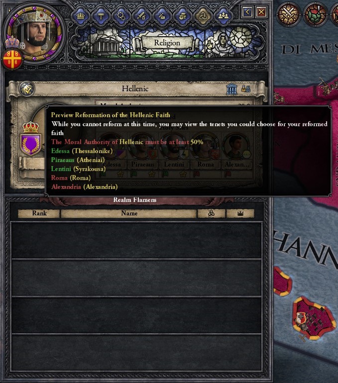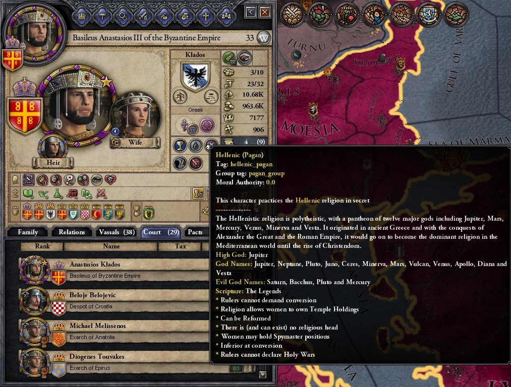 그리고 샤를마뉴 시나리오에서 비잔티움 쪽 영주로 헬레닉 개혁을 시작하려면 최소한 헬레닉 성지가 있는 지역을 갖고, 미치광이 트레잇이 있을어야 하는데 이단 교파는 고전 연구 디시전이 안 뜹니다. 처음에 할 때 모르고 왜 안 뜨지? 생각했는데 혹시 몰라서 정교회로 갈아타니까 떴네요.