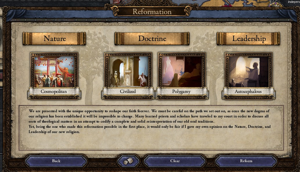 개혁하기 전에 찍은 스샷인데 리더십에서 세속 영주=종교 지도자 교리를 고르니 폰티펙스 막시무스 작위를 받았네요.
