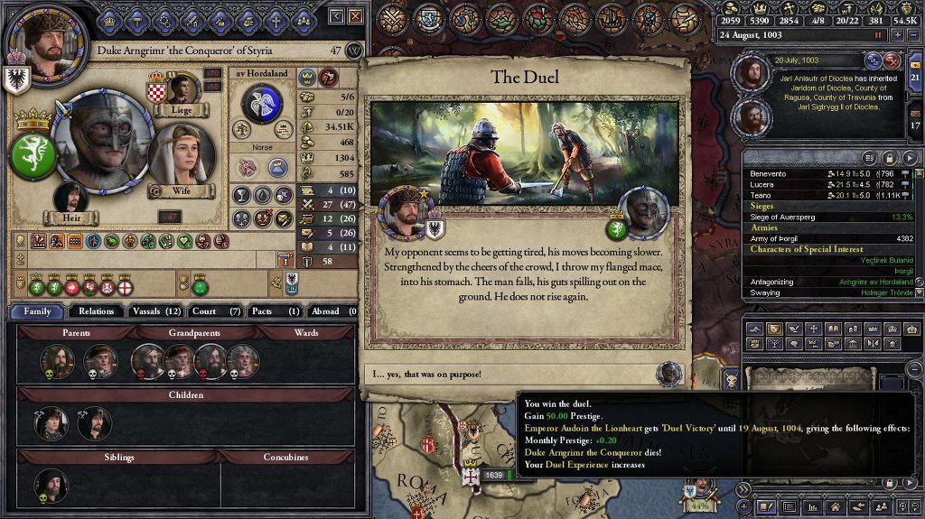 적대(Antagonizing)를 두번 정도 하다보니 모욕감을 느꼈는지 결투를 신청하더군요. 결투 58인데 전 결투셋으로 갈아입어도 57이라 마음의 각오를 하고 세이브 하고 결투에 나갔는데 승리, 그대로 침략을 준비하던 도적놈을 죽였습니다. 신나네요