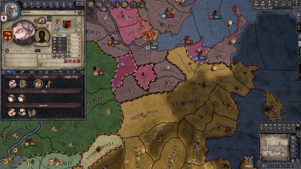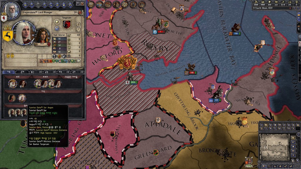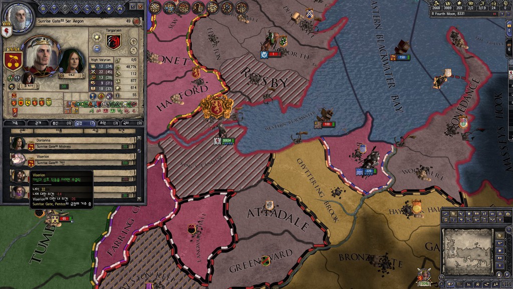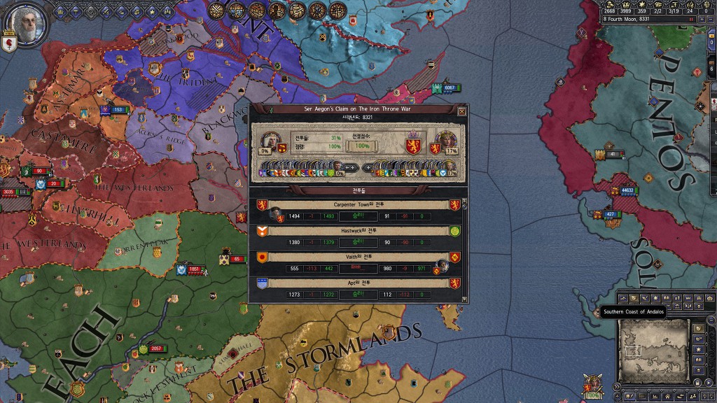 한참 왕겜모드를 하는 와중에 타르가르옌 가문이 철왕좌 클레임을 걸고 들어와서 로버트 바라테온 사후에 라니스터가 들고있던 철왕좌에 반란을 일으킨 상태인데 보시는것처럼 100%채워도 승리 선언을 안하시는 에이곤니ㅁ...