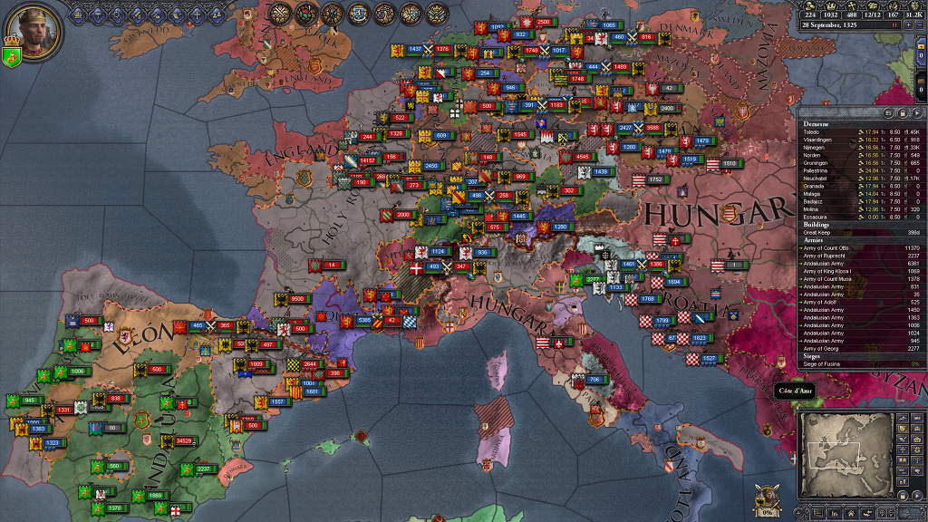 이베리아와 프랑키아에 달하는 대 제국을 증조할아버지이신 선대 황제가 일구어 놓았지만 칼침맞고 반란군놈의 쉑히들에게 운명하신지 100년만. 안달루시아 왕까지 성장한 증손주가 드디어 사악하고 무능한 찬탈자 황제를 터는 팩션을 일으키고 최후의 결전이 벌어지는 모습입니다. 진짜 패싸움이 뭔지 보여주네요 아아... 아름다워 ㅠㅠㅠ!