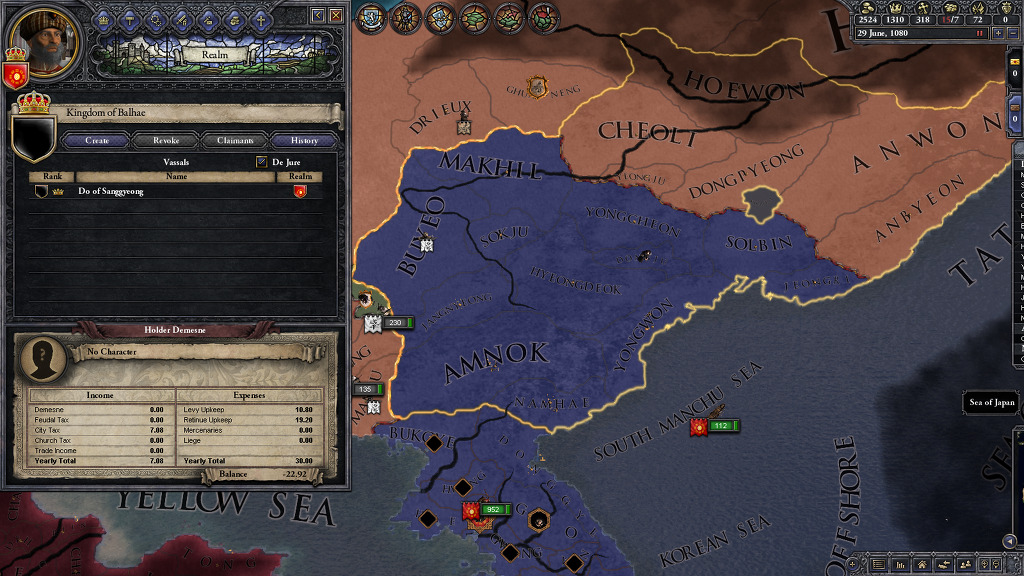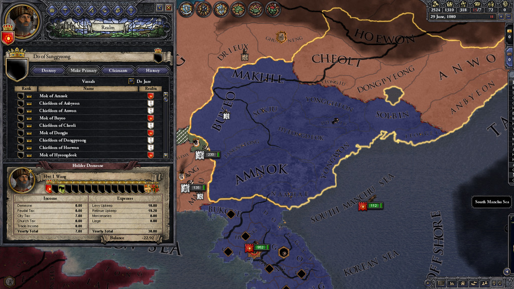 '고려 왕은 고토 발해의 클레임이 있다' 라는 컨셉으로, 콘솔 명령어로 발해 남부에 클레임을 주고 플레이해 보았습니다.