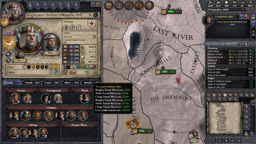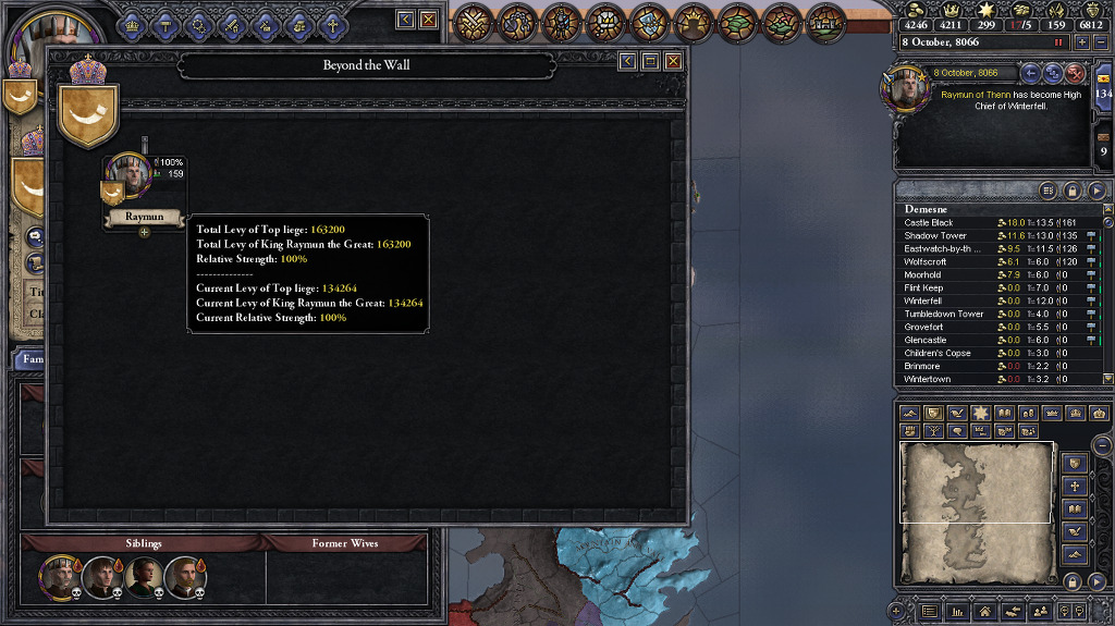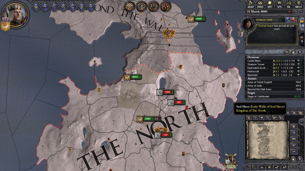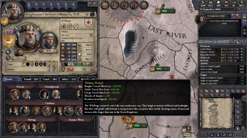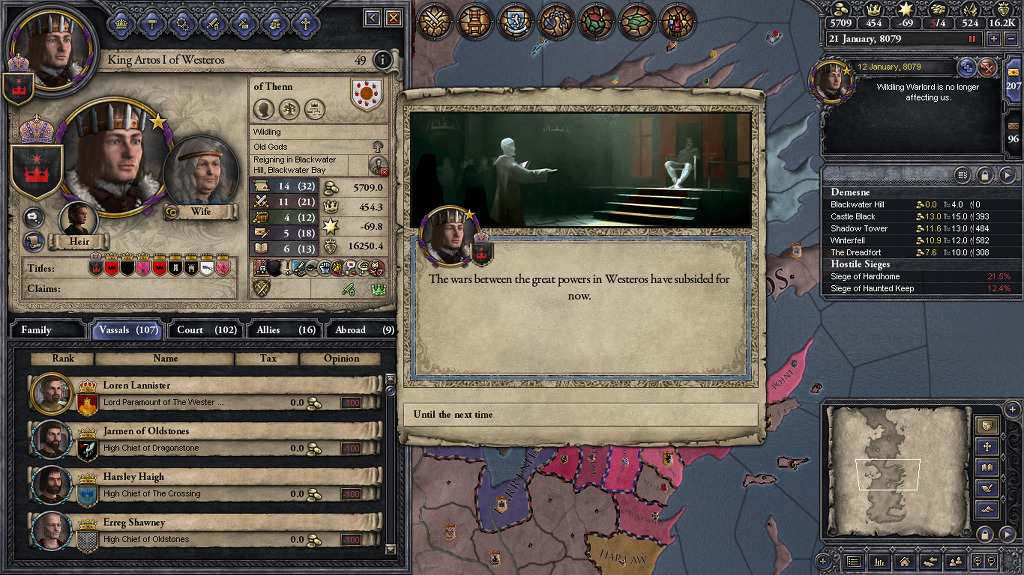 그리고 봉신과의 관계에 있어서 충성등의 이벤트가 계속뜨는데, 와이들링과 일반인의 관계도는 무조건 -75패널티를 받아서 죄다 -100... (게다가 종교도 다르니...) 그래서 이벤트 뜨기만하면 독립