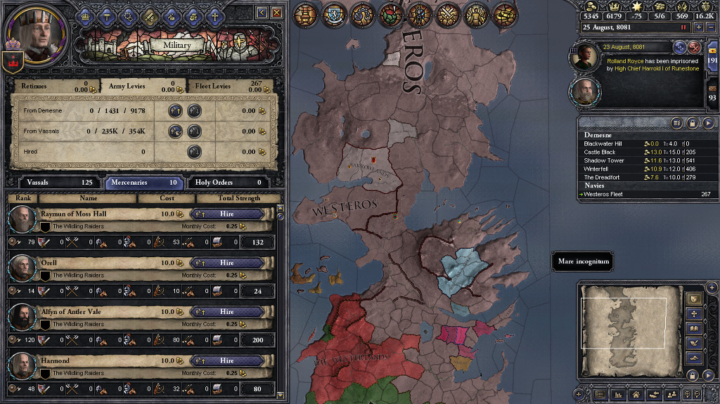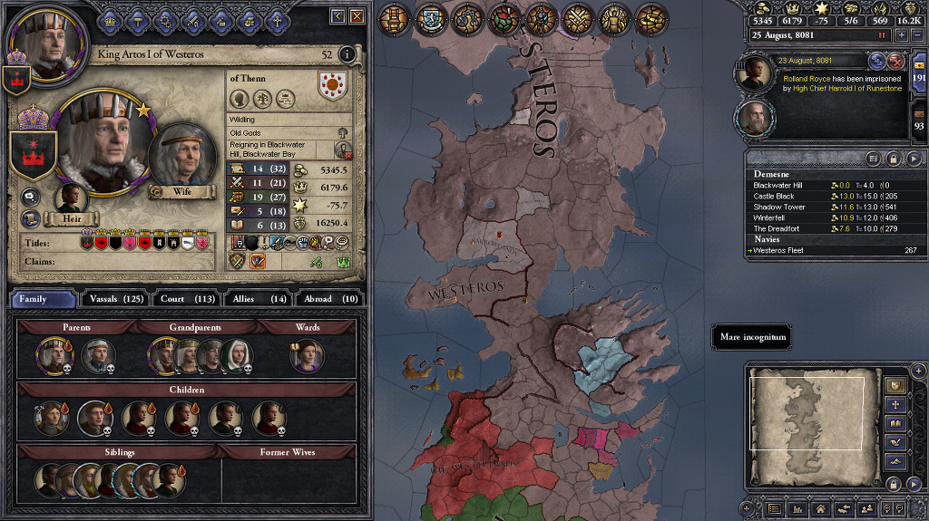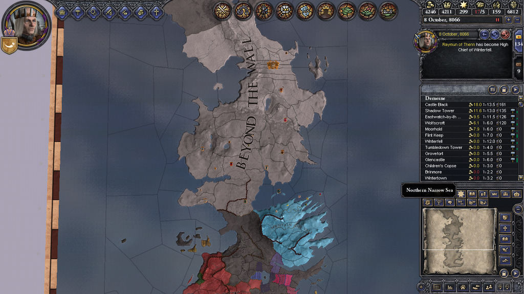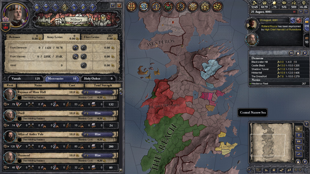 그리고 웨스테로스 왕국 디시젼을 실행하니 뭐라 잡소리 뜨면서 야만족왕, 노스, 클리프, 아이언 아일 왕위 죄다 사라지고 웨스테로스 왕위만 남음. 킹스랜딩 어쩌구 이벤트 뜨면서 클레임 주는데 백워터힐이 킹스랜딩으로 바뀌진 않네요. 수도 변경했는데, 성채도 안지어진 어촌마을에 홀딩 6개 비어있는 똥땅임. 개쓰레기;;; 그냥 스톰랜드먹을걸...