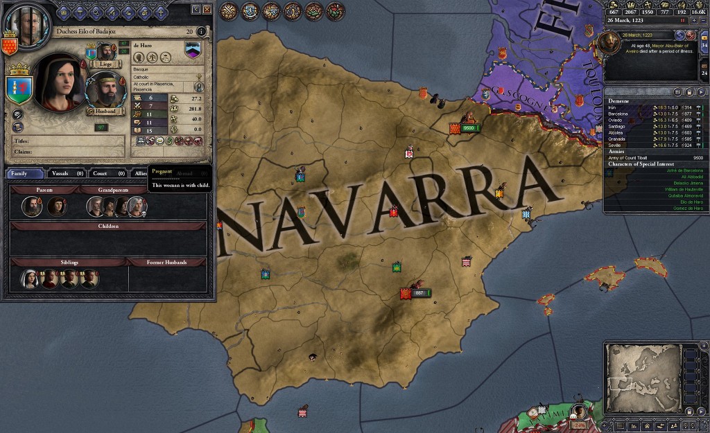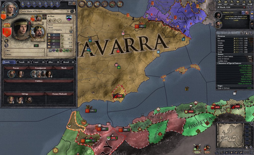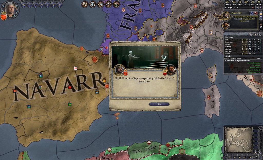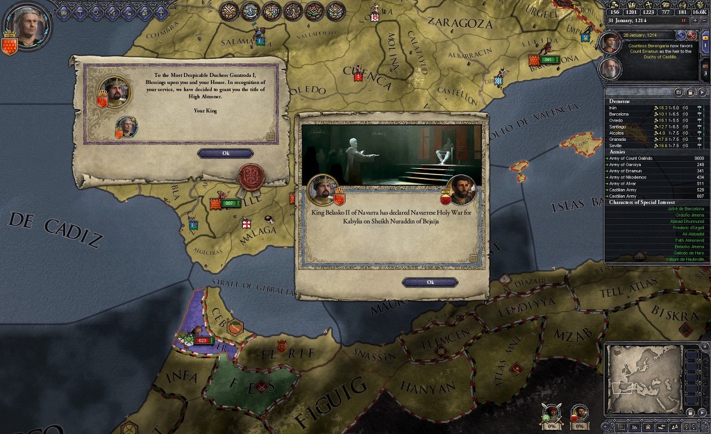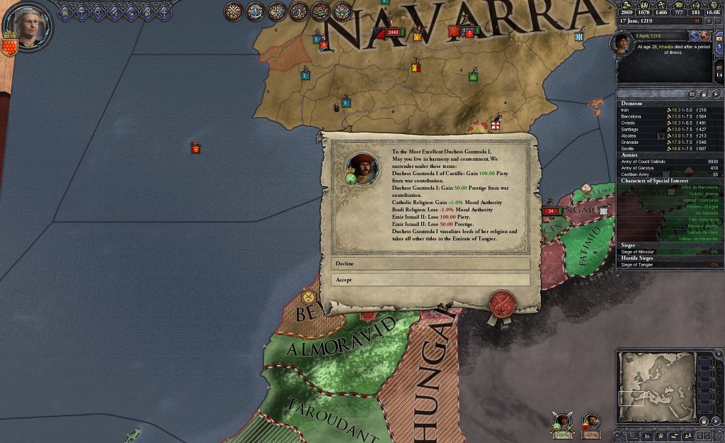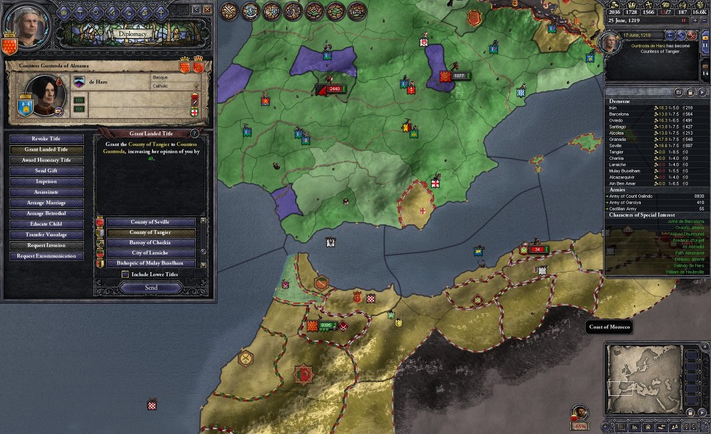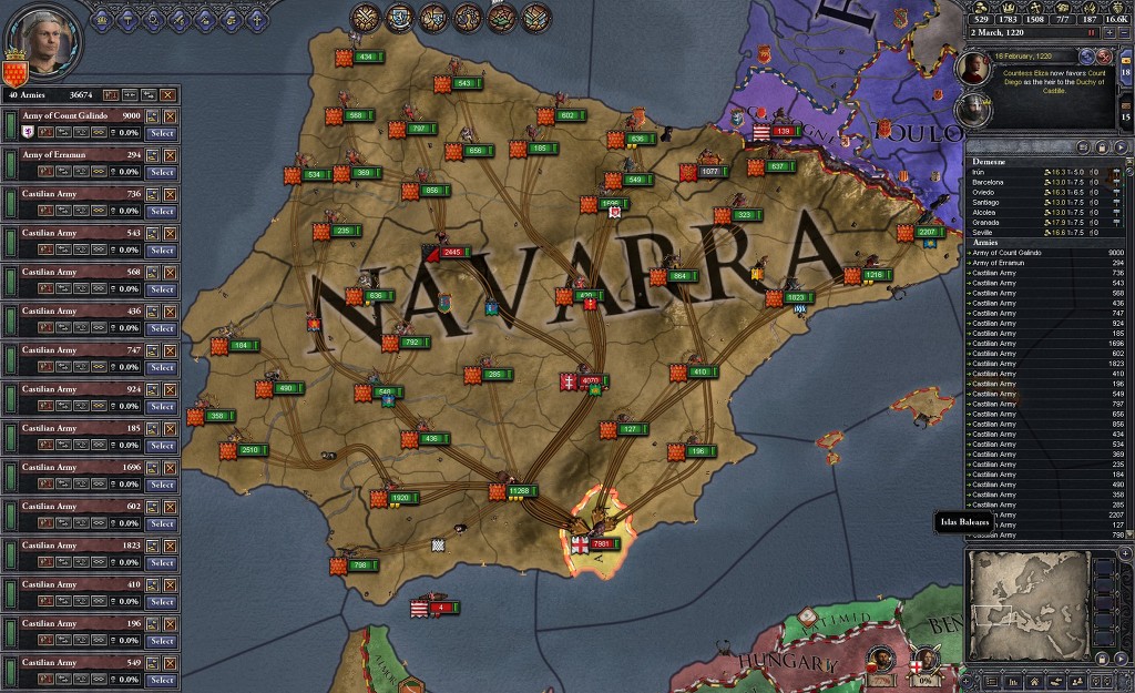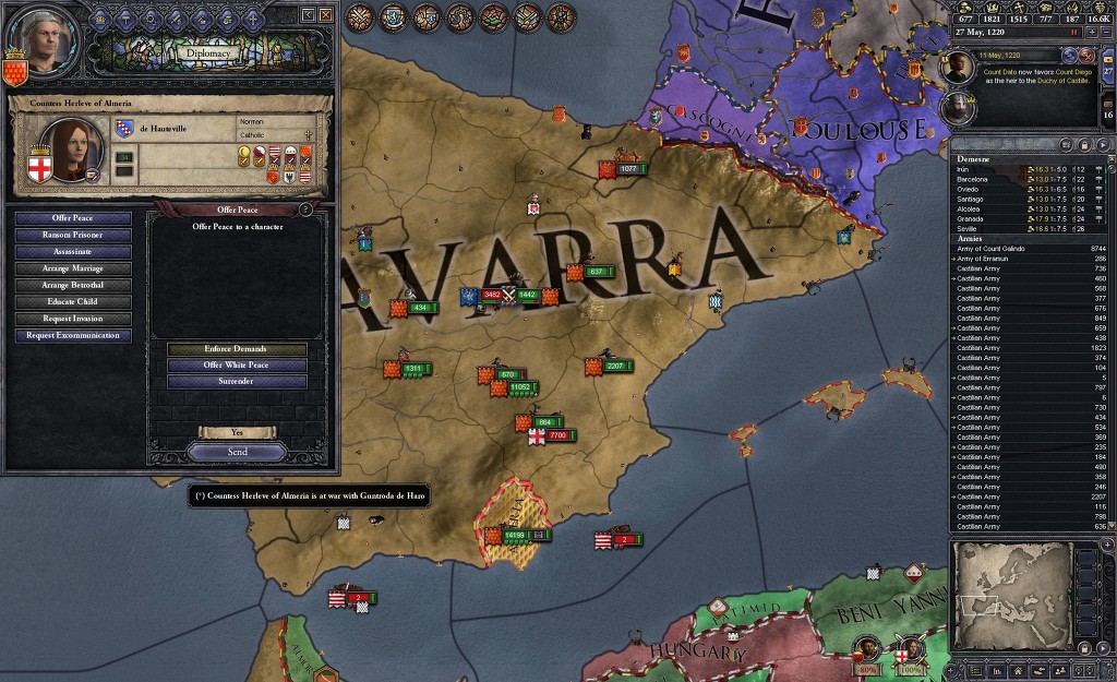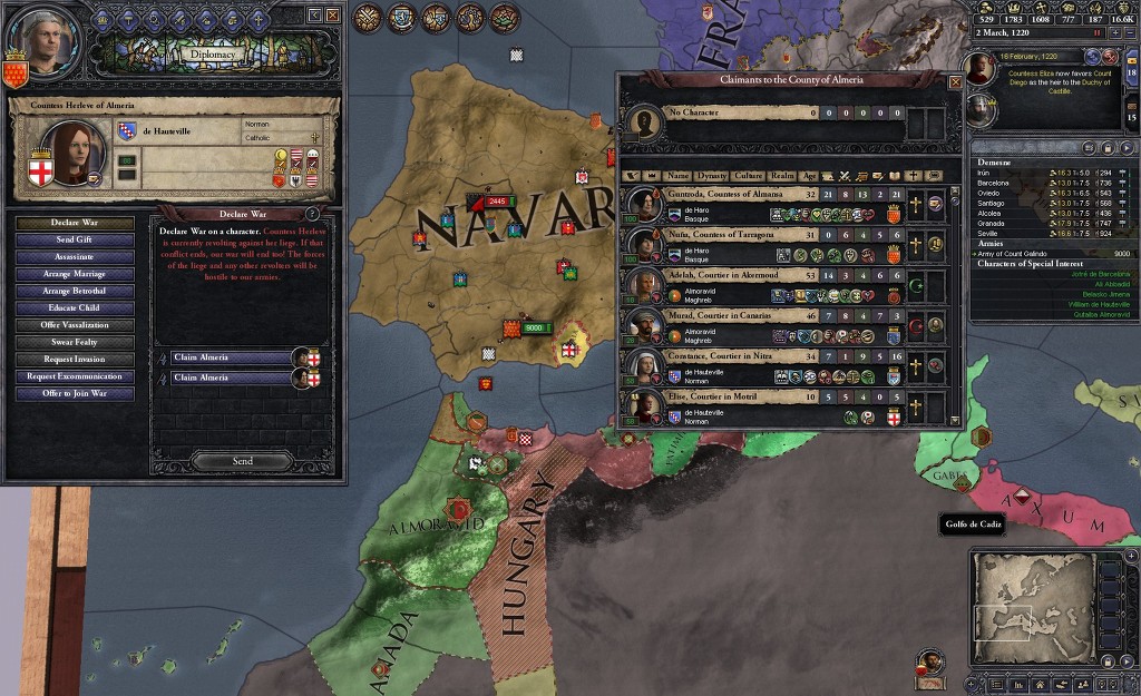 2013-03-08_00001 1220년 3월 2일 어미의 뜻을 알았는지 두 딸이 경쟁적으로 알메리아 백작령에 대한 클레임 확보에 성공합니다. 큰딸의 클레임으로 공략하기로 합니다. 작은딸은 일반 결혼을 하였기 때문에 자연 세습이 안되어서 자꾸 자식에게 타이틀을 줘 버리네요