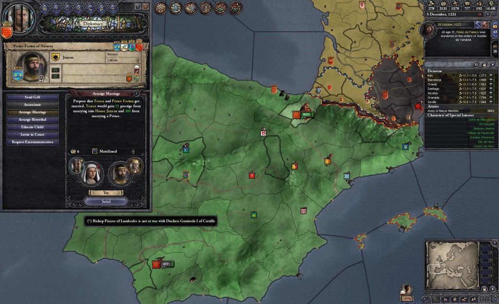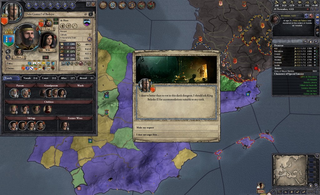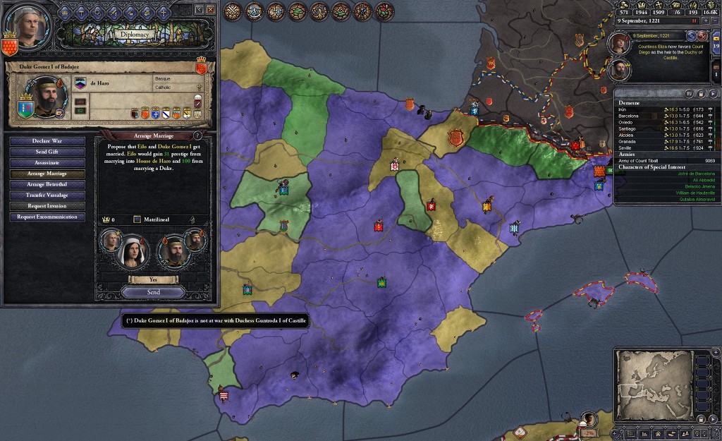 2013-03-08_00015 이 시점에서 족보를 한번 꺼내봅시다. 바다조즈 공작 고메즈를 그냥 놔둘경우 공작위는 셋째딸 마이오 나바라 여왕에게 전해지고 그 다음 순위는 지메나 왕가인 엔리케에게 가게 됩니다. 주군의 잔머리가 대단하군요. 이 사태를 막으려면 고메즈가 죽기전에 아들을 얻어야 합니다.