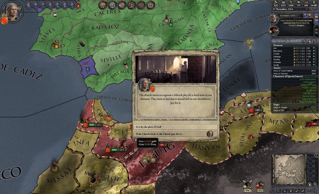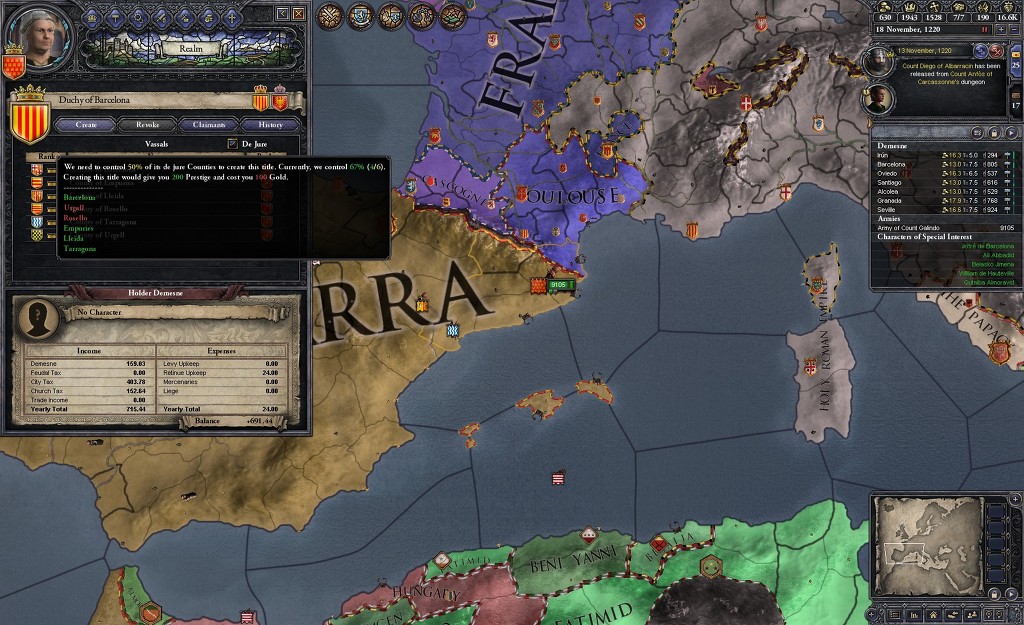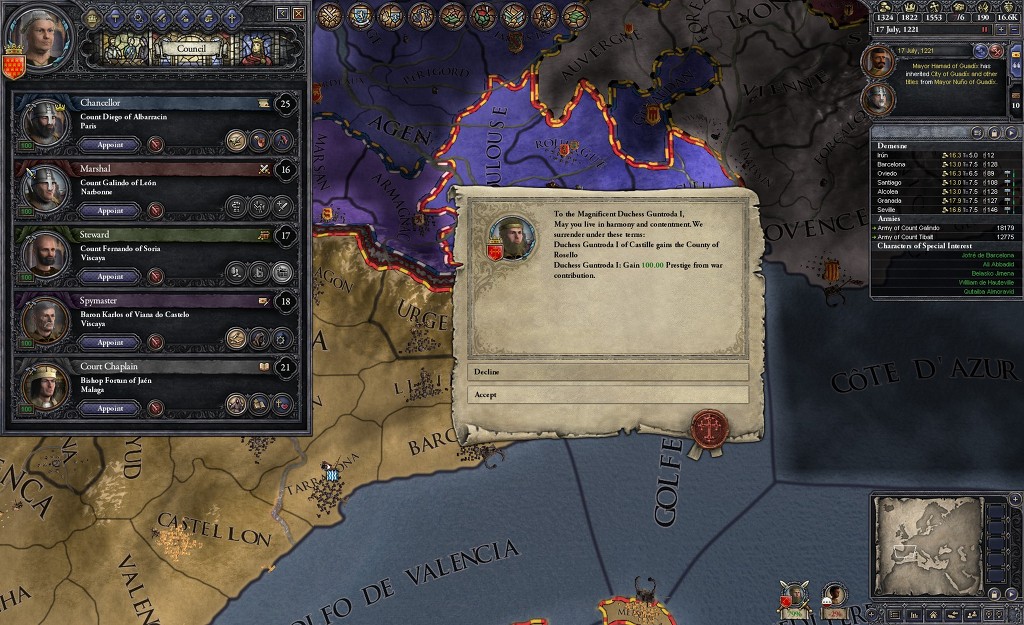 2013-03-08_00007 바르셀로나 공작위를 받기로 합니다. 이것으로 로셀로 백작령에 대한 영지 클레임이 생기게 될껍니다. 그 대가로 아라곤 공작위는 파기 합니다. 봉신들의 불만이 커지겠지만 어쩔 수 없습니다