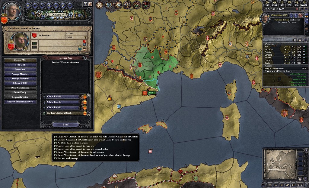 2013-03-08_00003 1220년 5월 27일 반란중인 단독백작령 따위는 이베리아 반도에선 설 자리가 없습니다. 이제 이베리아 반도에서 수복하지 못한 땅은 바르셀로나 공략전에서 놓쳐 버린 로젤로 백작령 뿐입니다. 지금은 툴르즈 공작 지배하에 있습니다