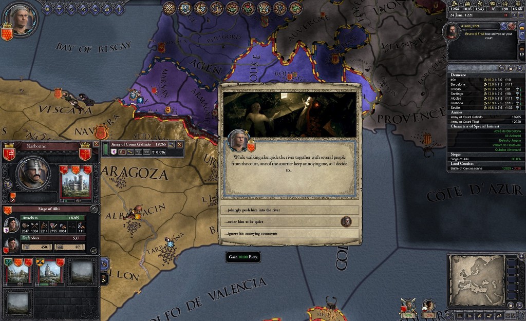 2013-03-08_00008 아들을 가두었던 오만한 로셀로의 어린 백작의 죄를 묻는다는 명분으로 툴르즈 공작에게 전쟁을 선포합니다. 후방의 봉신병력을 싹 긁어와서 한방 승부를 노려볼 참 입니다