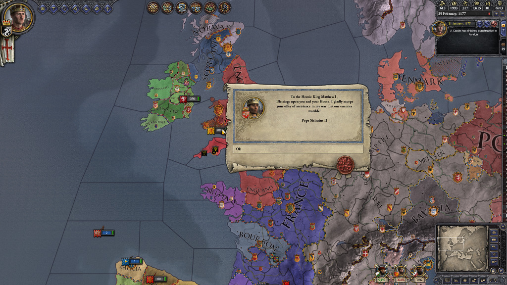 교황에게 참전서신을 보내지만 아직은 잉글랜드군을 몰아내는것이 급선무입니다.