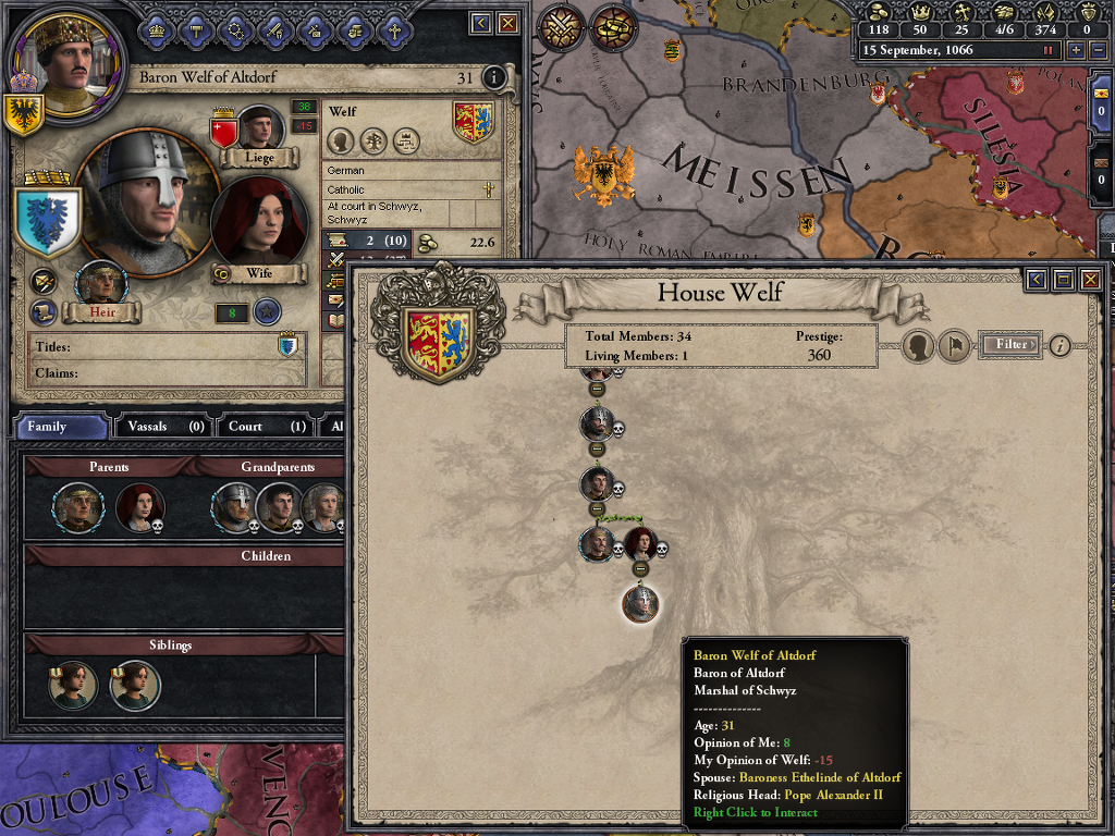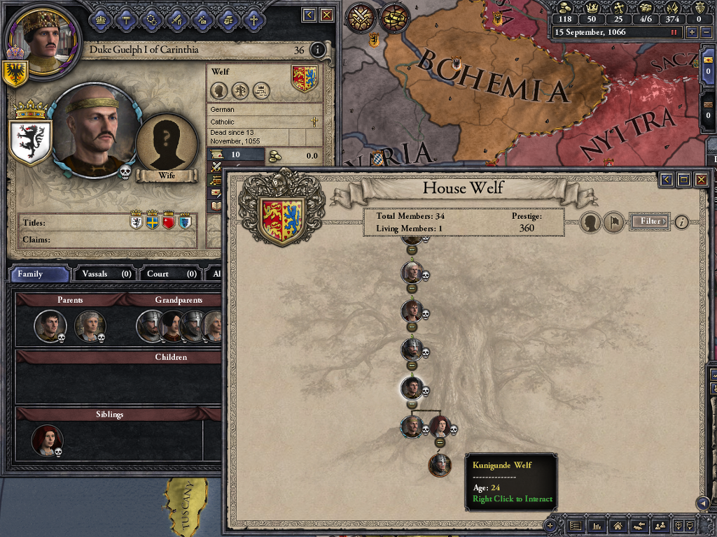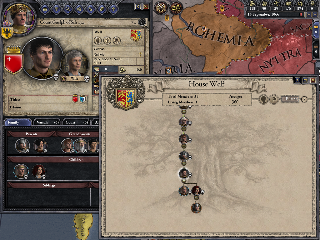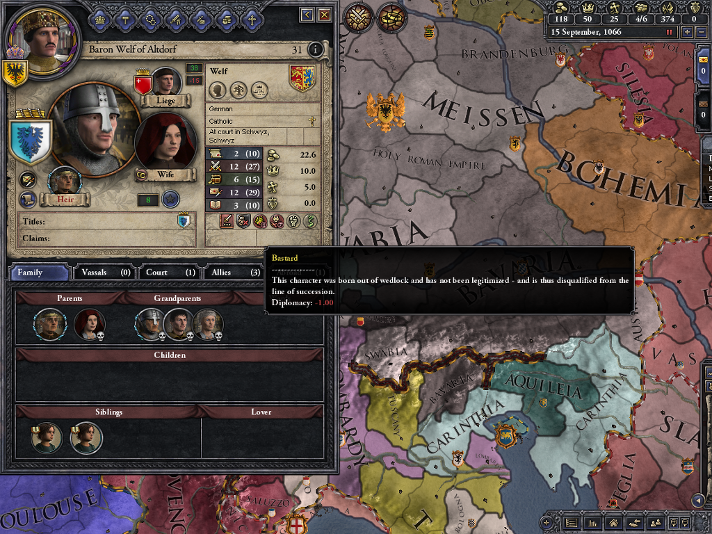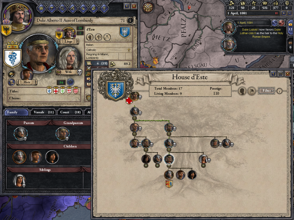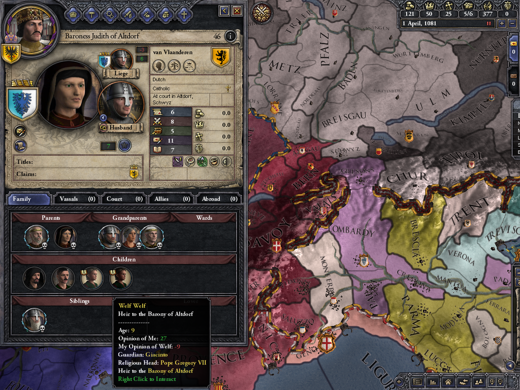 재기를 기대하며 머무른 곳이 바로 Altdorf... 게임 내에서는 롬바르디아로 편입되어 있더군요. 슈바벤 분파에서 Count of Altdorf로 지내던 벨프 2세는 두 번 결혼에 1남1녀를 둡니다. 장남 벨프 3세는 카린티아 공작이자 베로나 후작이 되었지만1055년에 사망하면서 결혼도 안하고... 자손도 남기지 않습니다. 그럼 이 많은 영지는...?