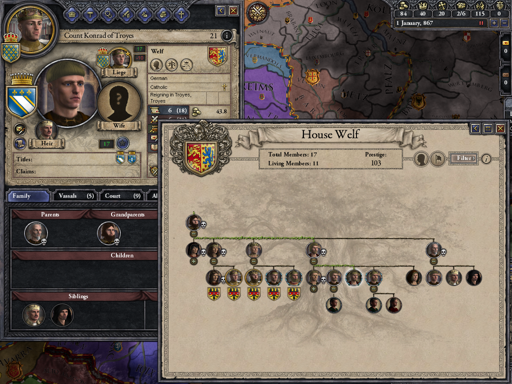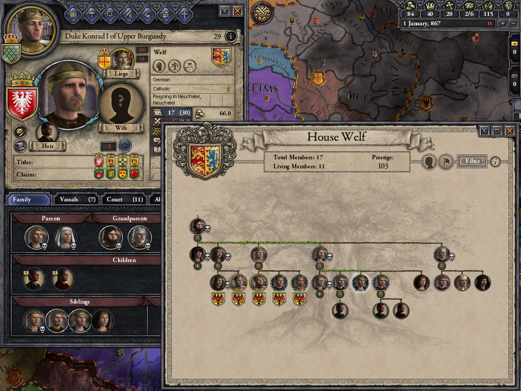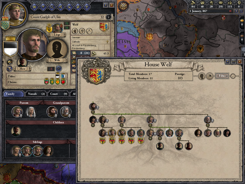 어찌하여 합스부르크 가문에서 통하는냐구요? 이것도 결혼빨입니다... 그의 어머니는 헤센-다름슈타트 후작의 딸 앤 엘레오노어의 딸이었는데 이 분 족보 타고 올라가면 합스부르크 가문의 분가랑 만납니다. 루돌프 4세의 형제였던 알프레히트의 후손이었죠. 호엔쫄레른 가문도 만납니다. 이 족보를 타고 가면... 진짜 이 헤센 가문이 갑인데 크루세이더 세계에선 안보여서... 모르는 건 패스죠... 하여간 이 헤센 가문은 대단한 집안이에요. 물론 중세 이후로...