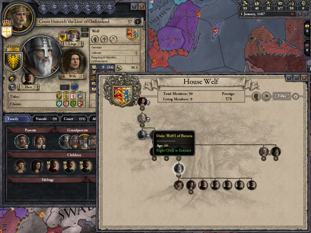벨프 가문은 상당히 오랜 역사를 지니고 있습니다. 가문의 이름이 드러난 시점이 819년경이니... 그야말로 천년이 넘는 세월을 유지해온 셈입니다. 벨프 가문은 역사적으로 Elder House of Welf과 House of Welf로 구분합니다. 남계직속이 한번 단절되면서 구분된 것이죠. 보통 게임 내 1066년을 기점으로 구분될껍니다. 올드갓 시나리오는 Elder House of Welf이고 1066년 이후는 오늘날 영국왕실을 배출한 House of Welf입니다.