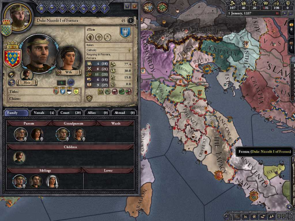 그럼... 이제 알베르토 아쪼 2세의 아들들의 운명이 결정됩니다. 벨프는 어머니 성인 벨프 가문을 따르고 그 영지를 물러받고 풀코는 아버지쪽 영지를 물려받고 데스테 가문을 이어갑니다. 이렇게 형제에 의해 두 가문이 형성되고... 이 둘 다 명문 가문으로 이름을 떨치겠죠... 그럼 데스테 가문은 마지막 끝에 넣는것이 좋을 듯 하네요. 이 가문 역시 이탈리아의 명문인지라... 참고지만 지금은 남계 단절이라 외손들 밖에 없어요. 이건 나중에 소개하죠.