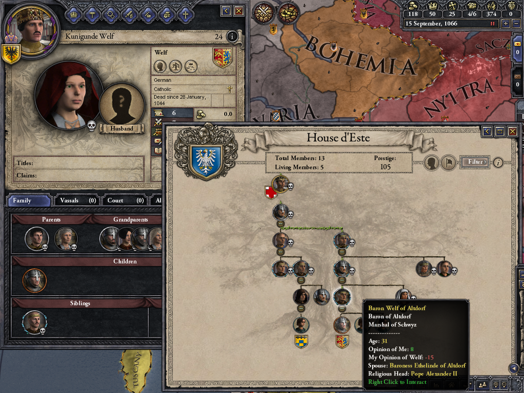 게임 속에서 1066년 데스테 가문 열어보면 무엄하게도 벨프가 서자로 나와있더군요. 이건 아마도 Altdorf를 백작이 아닌 남작령으로 표기해서 나온 것이 아닐지... 쿠니군데는 1035년 알베르토 아쪼와 결혼해서 아들 벨프를 낳습니다. 이 벨프가 바로 하노버 왕가의 직계조상이죠...