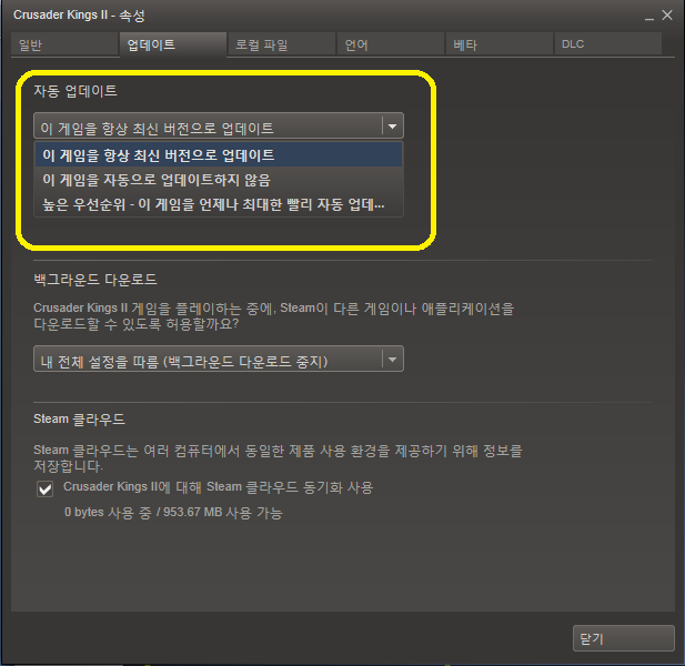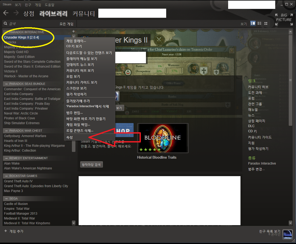: 노란원 안의 'CrusaderKings2' 이름 위에서 '우클릭'을 하면 다음과 같은 화면이 나옵니다.