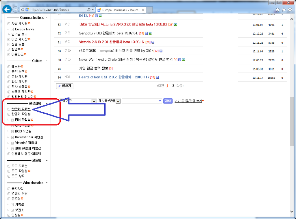 : 게시판 중에 '한글화 자료실' 클릭.