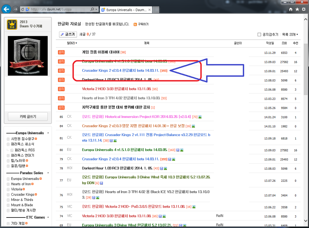 빨간 원 안의 mod파일( CK2 2.0.4 mod 140311.7z ) 을 다운 받습니다.